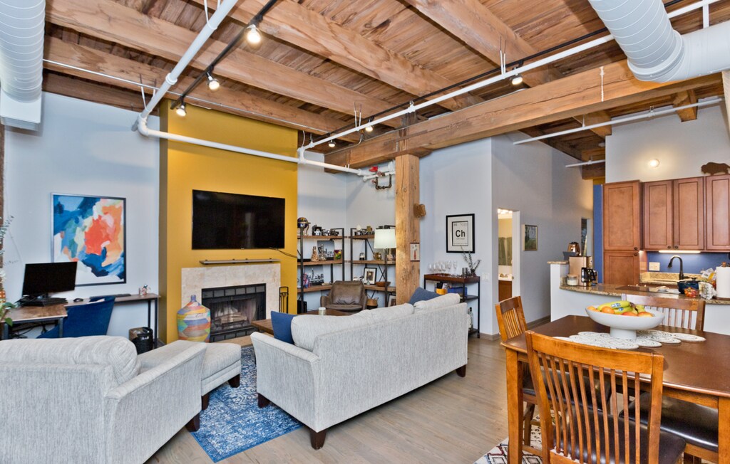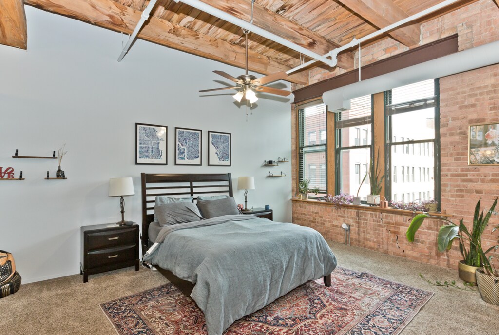 This gorgeous and spacious 1300sqft timber loft with 12ft. ceilings and exposed brick walls welcomes you home! Two large, fully enclosed bedrooms, basked in south facing natural light make this a loft in hot West Loop that you don't want to miss. The living area features an open floor plan, decorative fireplace, a wall of windows and plenty of room for a dining table. Newer kitchen cabinets and stainless appliances in kitchen, granite countertops with a breakfast bar that overlooks the family room. Both bedrooms are generous in size, the primary bedroom is HUGE and will easily fit a king sized bed and features a massive 13x7 walk-in closet and attached bath. Second bedroom will fit a queen bed or would be perfect for a guest room or home office, and also features a great sized closet. Ample storage throughout, a patio overlooking a tranquil courtyard, and in-unit washer/dryer completes this unit. Storage, cable and internet are included. One pet will be accepted with pet fee, dogs under 40lbs. Walk to local West Loop restaurants, Target, Mariano's - Blue line one block away and walking distance to UIC.
