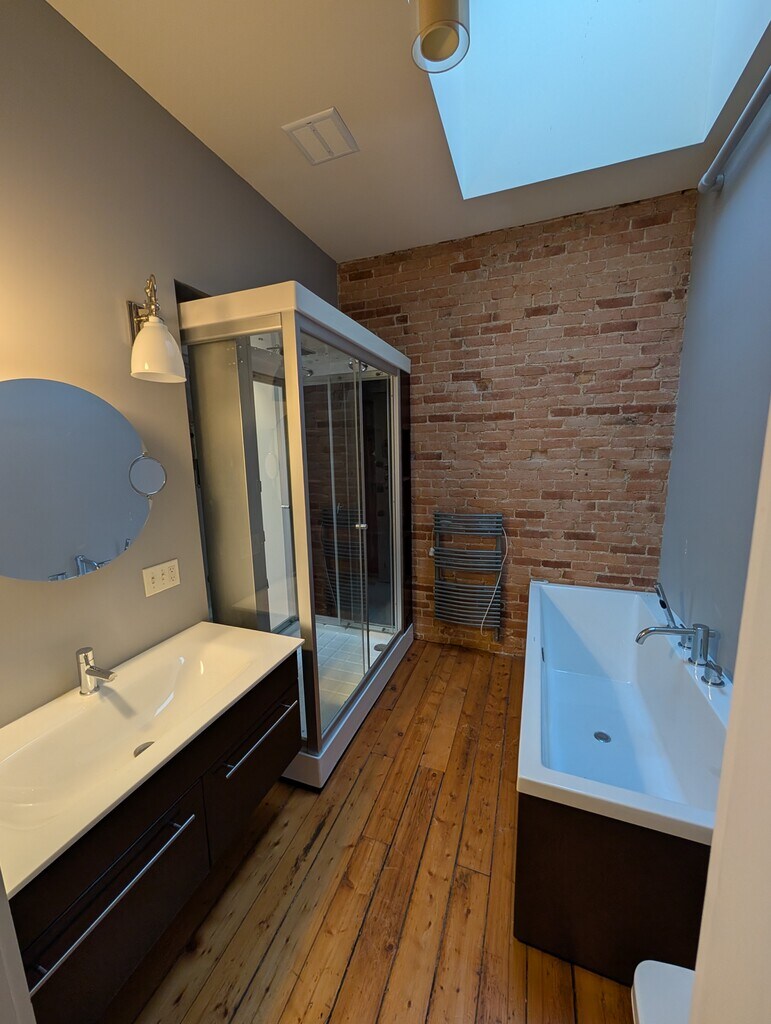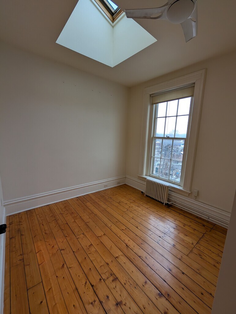 This stunning apartment is located on the third floor of the historic First National Bank Building built in 1868 steps from the four corners in downtown Bennington. This apartment features floor to cieling windows overlooking the town with breathtaking views of the mountains and the bussling downtown. Multiple skylights pour sunlight into the lofty space. 10 foot cielings and exposed brickwork, refinished original floors and timber give the space an immense amount of character. The kitchen has tons of counterspace, with the ability for an eatin kitchen or space for a dining room table, with butcher block countertops galore. The bathroom features a steamshower with dual exits into the walk in closet or bathroom, as well as a full sized tub, heated towel bars and contemporary styling. Finishing off the bathroom is its very own skylight. As mentioned, there is a full walk in closet with washer and dryer included. This space also has a flex space suitable for a studio or office. Sitting on the third floor of a building with incredibly high ceilings, you can sleep above the fray in this suprisingly peaceful "city" apartment. This unit does not have dedicated parking, but is steps from free town parking with lots of avaliability. Heat, water & sewer are included. Tenant pays for electric & internet.
