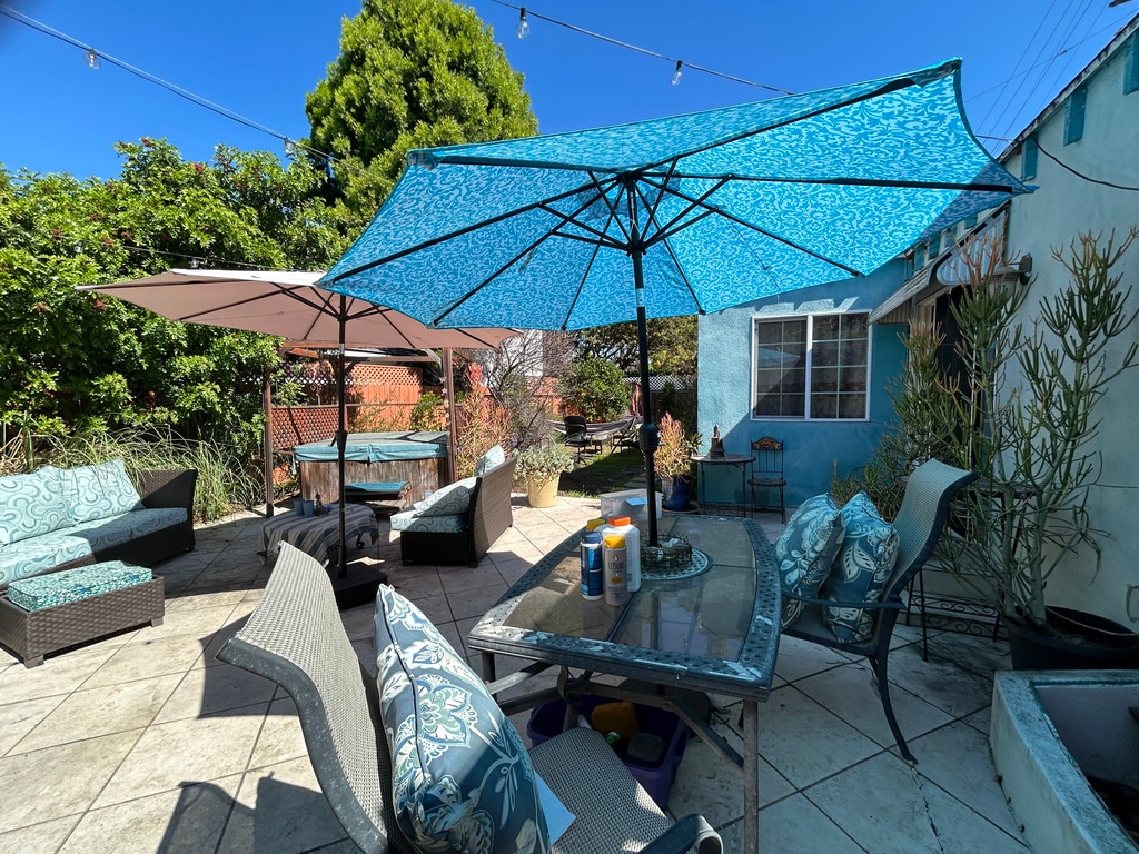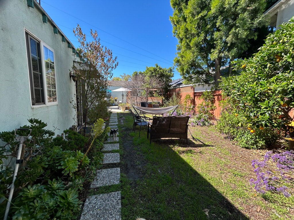 Very large beautiful 2-bedroom guesthouse, approx. 1300 sq ft. Large rooms, bright and airy, landscaped fenced yard, jacuzzi, separate gated side entrance and parking for two. I live in the semi-attached main house with 2 small dogs who are photobombing and love other dogs. This is perfect for a couple with a baby and/or dog, as there is a very large bedroom (wood floor & raised ceiling) with sliding door to a large shared patio and yard and another that can be an office or child’s room. Full kitchen/main room, washer-dryer, some furniture if needed. 1-2 car parking in rear. Rustic, homey feel. Asking $3400.00 Great location, near Santa Monica, Westwood, Culver City. Contact for more pics and info.