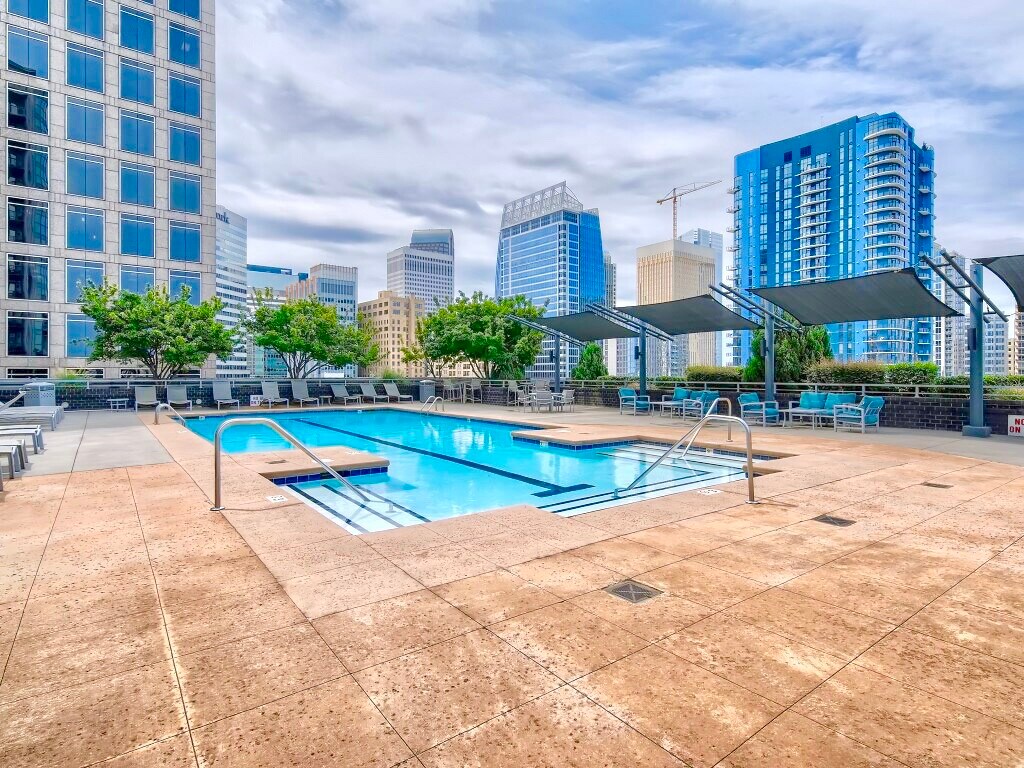 This Upscale Contemporary Fully Furnished Condo is located on the 12th Floor of Trademark-One of the most prestigious residential buildings of Queen City. Live steps away from where it all happens, near the vibrant restaurants and bars, Panthers & Knights Stadium, Spectrum Center and so much more! The condo offers two bedrooms with private bathrooms and walk-in closets, great entertaining space with kitchen island and open floor plan. And you won't stop enjoying those breathtaking views of Bank of America, Truist Tower and the gorgeous Carolina Skies. The building provides some amazing amenities with the sky pool deck, bbq, gym and recently renovated pool house. Roast some marshmallows at the fire pit or have cocktails enjoying the Knights Games and Fireworks!