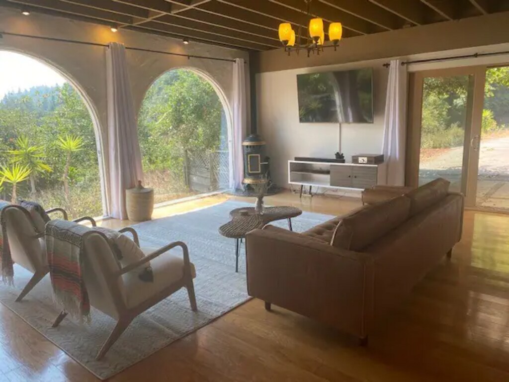 Located above the fog line in the Aptos hills, this 2-bedroom, 1-bath apartment sits on a 3.5-acre apple orchard, with Nisene Marks in the backyard. The apartment is two stories (approx. 1,650 sq. ft.) with living room, dining room, and kitchen downstairs with two bedrooms and one bathroom upstairs. The main bedroom has a king bed; the second includes a fold-out double sofa bed, desk, and dresser-prefect for an office. The bathroom features a vintage claw-foot tub and separate shower. The views from the upstairs span across to Arroyo Seco with the Moss Landing power plant towers in the foreground. The kitchen is fully equipped for everyday cooking and flows into a dining area with a large rough cut table. The open-concept living area has tall arched windows overlooking a native garden with a vibrant bird life, as well as a classic stand up parlor pellet stove for heat and ambience in cooler months. Outside, there’s a private patio lounge with wicker couch, bbq, garden, and a detached yoga studio. Included in the rent are all utilities-electricity, water, garbage, internet, and heating (all utilities). Location: 10–15 minutes from Aptos Village, Rio Del Mar, and Seacliff State Beach; 20–25 minutes to downtown Santa Cruz. Internet: Starlink high-speed connection (supports streaming, online gaming, and video conferencing with ease) with very little latency. Lease: Month to month