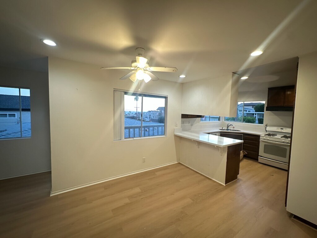 Enjoy the beach life in the Lantern District of Dana Point. With a 2 car garage this 1200 sq. ft. comfortable home is very reasonably priced for the area. It offers 2 large bedrooms, 2 bathrooms, 2 car garage, balcony and ocean views. Three blocks from PCH, shops, restaurants, Dana Marina Plaza and nightlife etc. Close to schools, Dana Point Harbor and beaches. This home has new wood flooring throughout, new carpeting in the bedrooms, new kitchen counter tops, LED lighting, large balcony, washer/dryer refrigerator. A very spacious open floor plan, light and airy with lots of closet space. Call to make an appointment. Owner pays for water and trash. Renter pays for gas and electric. No smoking inside.