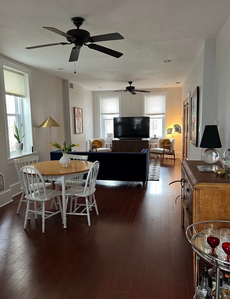 This is a rare opportunity to lease a beautifully updated 2,164 sqft, 3-bedroom, 1.5-bath, 3-story brick home in the vibrant heart of downtown Phoenixville! Perfectly located a block away to restaurants, the Colonial Theater, brewpubs, and the town’s popular walking and biking trails—everything you need for dining, entertainment, and leisure is virtually outside your door. Interior Features • Living & Dining: Enter through a covered front porch into a private entry way. Continue through double glass doors into a spacious living room and dining area. • Kitchen: The updated spacious kitchen featuring custom granite countertops, tile backsplash, an island with seating, glass-fronted upper cabinets, and premium stainless steel appliances including a Bosch dishwasher, Whirlpool refrigerator, stainless steel sink with garbage disposal, and an electric glass-top range. • Sunroom: Just beyond the kitchen, enjoy a sunroom with pantry cabinets and custom granite surfaces, opening onto the backyard. • Convenience: A half bath and utility closetoff off of the sunroom complete the main level. Bedrooms & Baths • Primary Suite: The master bedroom includes a lounge reading nook and a large walk-in closet with built in drawers, cabinets and ample hanging space. • Bathrooms: The spacious second-floor bath offers a tiled shower, toilet room, free-standing claw-foot tub, and a laundry center with a Bosch washer and dryer. • Additional Rooms: Two more bedrooms occupy the third floor, one with built-in shelving—perfect for a home office and the other, a large bedroom. Outdoor Living Step through glass doors to a private, fenced, and landscaped backyard retreat. Features include: • An oversized Trex deck with built in seating. A canopy, ideal for outdoor dining and entertaining. • Rubber pavers filling the ground level for low maintenance and year-round usability. • Privacy hedges on both sides for a peaceful, secluded atmosphere. Energy & Utilities • High-efficiency forced air gas furnace and two-zone central air. • On-demand hot water system to keep utility costs low. Location & Lifestyle This home places you right in the middle of it all—downtown convenience with a quiet, comfortable retreat waiting for you at the end of the day.