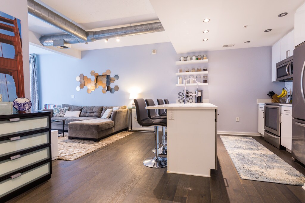 - *Top-Floor* Modern Industrial unit located in the quiet Virginia Square neighborhood - Just 2 blocks to VA Square Metro servicing Orange/Silver lines, with additional ample access to major thoroughfares and highways - Conveniently located between the lively Ballston Quarter and Clarendon neighborhoods. Just a short walk from each (5 blocks to Clarendon // 8 blocks to Ballston Quarter) - Rooftop garden has sweeping views of DC with sights including the Washington Monument, US Capitol, and National Cathedral - Close to Whole Foods, Trader Joe's, Harris Teeter, Giant - Walk Score: 93 Walker's Paradise - Transit Score: 75 Excellent Transit - Bike Score: 89 Very Bikeable - *Top-Floor Unit* with views of rooftop garden & Ballston Quarter - floor-to-ceiling windows - in-unit washer/dryer - quartz countertops - stainless steel appliances - dark hardwood floors - deep soaking bathtub with separate standing shower - only one neighboring wall - concierge 7 days/week to receive deliveries - bike room - gated garage parking with prime, extra large assigned parking spot location next to entrance/exit and just steps from elevator (*included*) - additional storage unit (*included*) - unit available unfurnished, or partially furnished for $75 additional rent - $500 pet fee - $50 pet rent - 1-2 dogs, depending on size