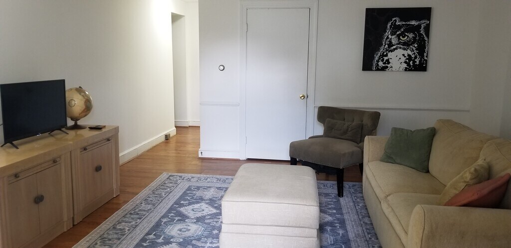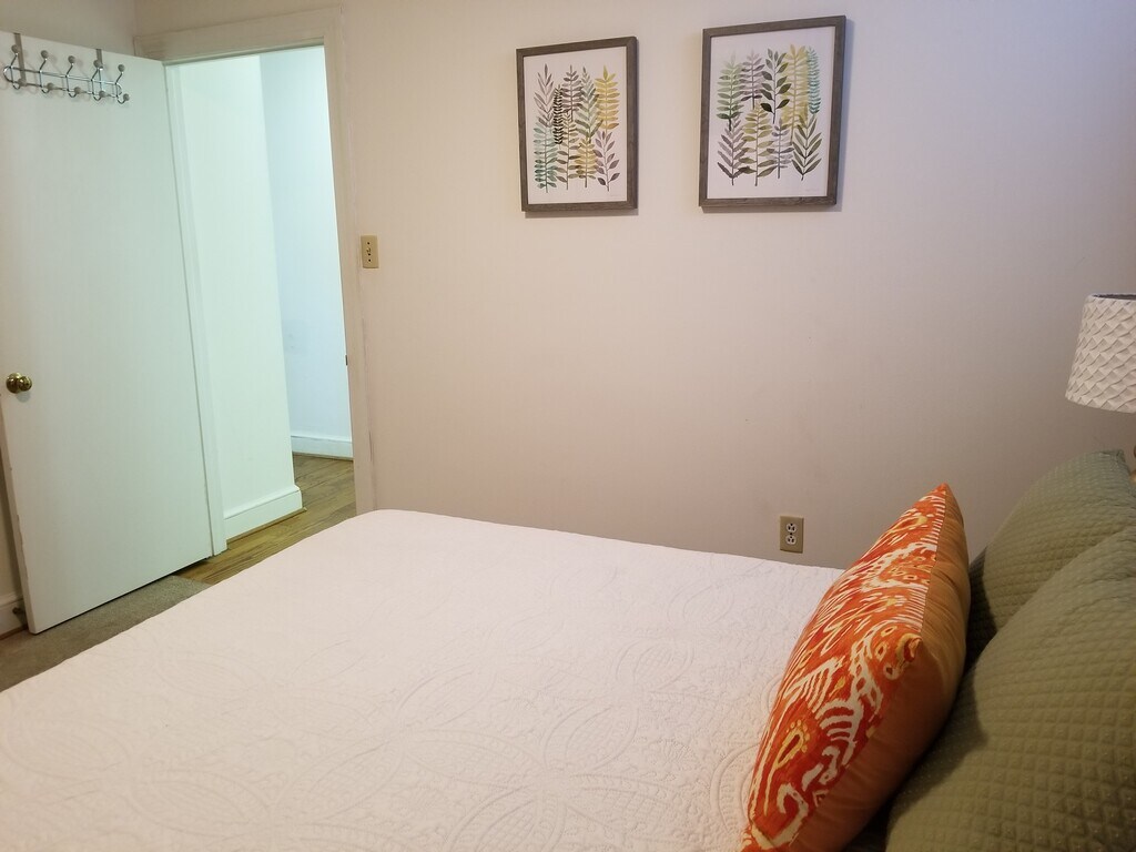 COMPLETELY FURNISHED RENTAL. Perfect for traveling professionals or students or those renovating or selling a home and are in limbo until the new home is ready. Cozy and stylish one bedroom apartment in the heart of downtown, historic Winchester. This completely furnished apartment has everything you need for a short or extended stay. Linens, pots, pans, plates, glasses, utensils, cookware. Located one block from the beautiful Handley library and two short, walking blocks to the Old Town Winchester pedestrian mall with shops, restaurants, museums, jazz, comedy and music halls, breweries, wine bars, and more. This is the perfect apartment for traveling professionals like nurses, physical therapists, IT, etc. Great location. Amenities. Private entrance with screened patio overlooking a grassy courtyard. Assigned private parking space. Come see for yourself or take a video tour and read rave reviews from past guests and tenants. This one bedroom apartment is located inside a huge, 1840s house in the historic district on Fairmont Ave. It is a basement apartment with separate, private entrance and windows for light. Comfy, Queen-sized bed with large closet, dresser, nightstands and a well-working window unit air conditioner that cools the entire apartment really well. Full-sized kitchen with stove/oven, microwave, toaster oven, coffee maker, full-sized fridge, small dishwasher and dining room table and chairs. Bathroom with tub/shower combo. Two separate linen and coat closets. Living room has an Italian leather sectional sofa. Patio has a small table with chairs for enjoying your morning tea or coffee, lunches, dinners and cocktails. Call or email to book today! No pets allowed unfortunately. No matter how cute your fur baby is, we cannot accept pets.