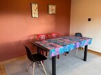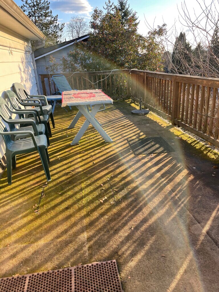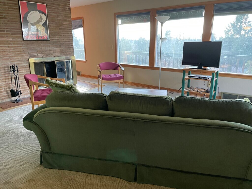 This is the upper, street level , half of duplex. It is being let furnished. It has living room, 2 bedrooms, dining room. kitchen, bathroom and private patio. Main bedroom has a queen bed; second bedroom has a full size Murphy bed and could therefore be used as an office or other space. There is a washer/dryer located in the second bedroom. Fully equipped kitchen with dishwasher. Gas central heating, A/C and a fireplace. Street parking, on a bus line and fairly close to Max at Gateway. Located on the west side of Rocky Butte, the apartment has wonderful views to the west.