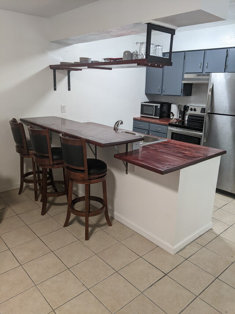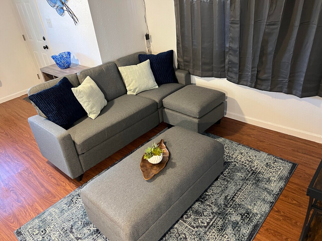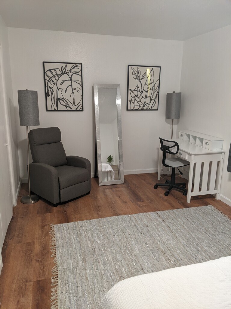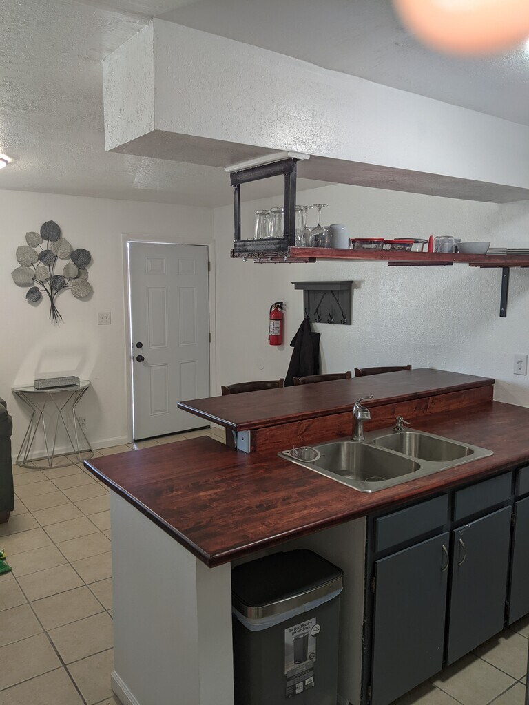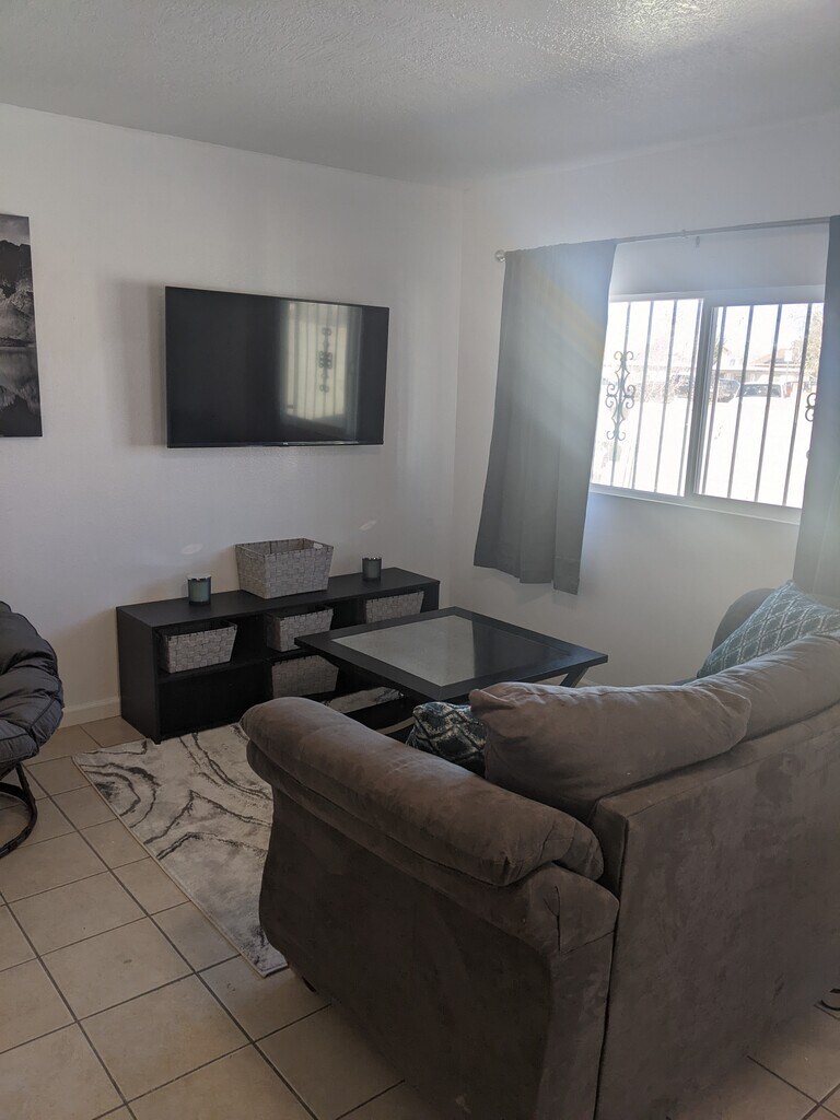 • Fully furnished, remodeled apartment in Albuquerque • Private feel, close to I-40 for easy commuting • All utilities included: electric, internet, gas, garbage, water • Enhanced security with heavy doors and Ring cameras • Kitchen with butcher block countertops, Breakfast bar • Includes coffee maker, pots, pans, microwave, dishes • Large bedroom with 2 closets, adjustable lighting • Living room with 50" Smart TV and recliner • Onsite laundry, no pets allowed • In unit furnace and cooling controls Required Fees Application fee $40 Security Deposit $500
