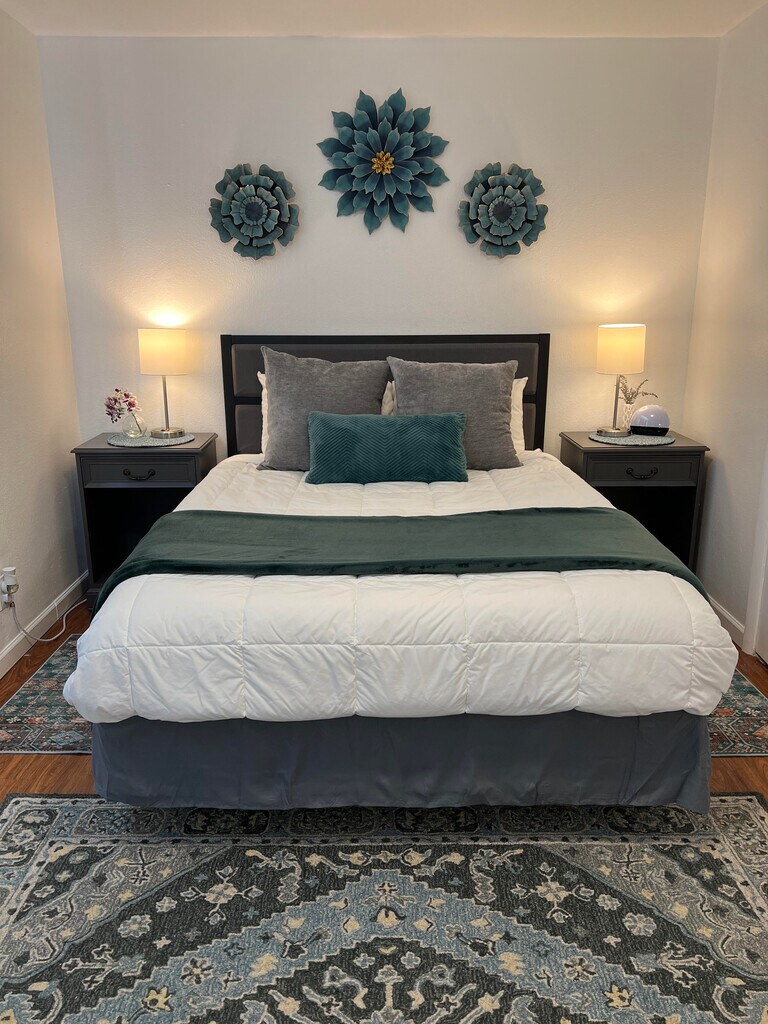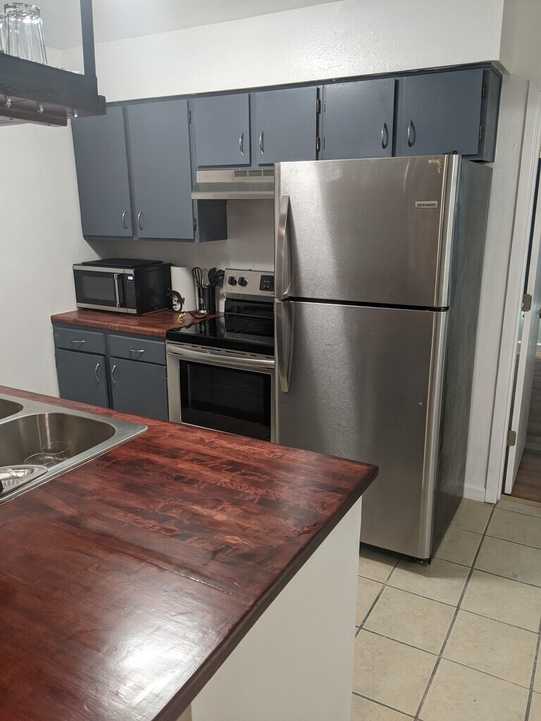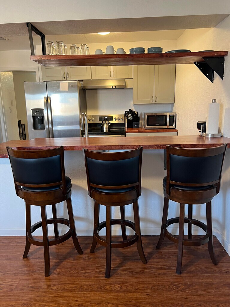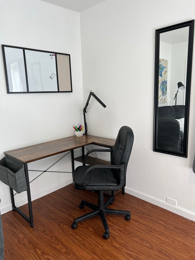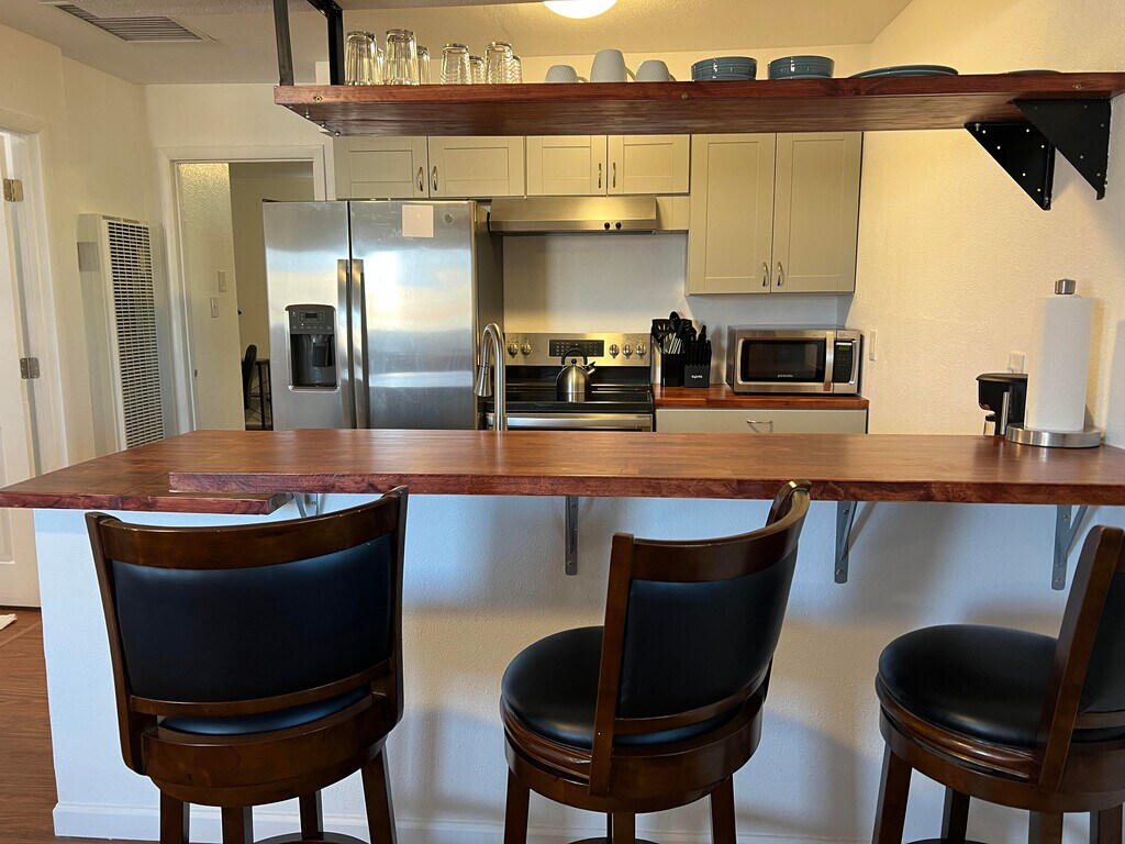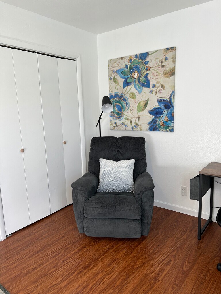 • Fully furnished, remodeled apartment in Albuquerque • Private feel, close to I-40 for easy commuting • All utilities included: electric, internet, gas, garbage, water • Enhanced security with heavy doors and Ring cameras • Kitchen with butcher block countertops, Breakfast bar • Includes coffee maker, pots, pans, microwave, dishes • Large bedroom with 2 closets, adjustable lighting • Living room with 50" Smart TV and recliner • Onsite laundry, no pets allowed • In unit furnace and cooling controls Required Fees Application fee $40 Security Deposit $500