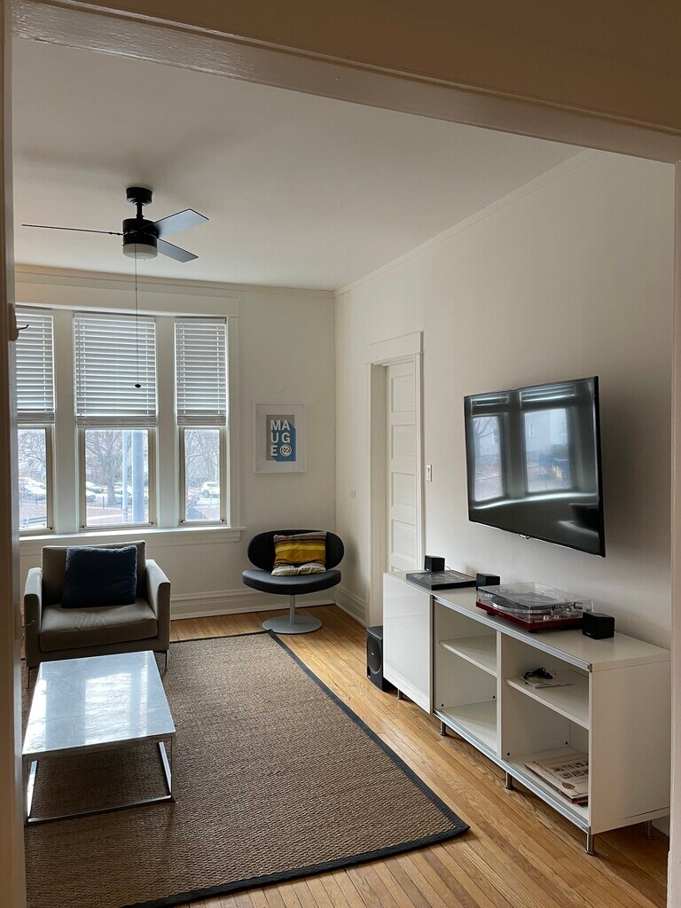 Rent a FULLY FURNISHED three bedroom, sunny apartment in Avondale, close to I-94, grocery stores, restaurants, and public transportation. This apartment on a sunny street is the only unit above a hip architectural studio on the first floor. Perfect for students or anyone new to Chicago, this second-floor apartment has been renovated with a new kitchen and bathroom shower in 2022. Kitchen includes a refrigerator, dishwasher, stove, oven, microwave and several other appliances including a coffee-maker and electric kettle. Dishes, silverware, cups and glasses are provided. Furniture includes a dining room table and chairs, sofa, club chair, tv, and console in the living room. Bedrooms are clean but small, and vintage. Each bedroom is furnished with a bed, night stand, dresser, and a desk. There is a washer and dryer in the unit. Air conditioning and heat is provided, but gas and electricity will be paid by the tenant. Move-in ready, all you need are sheets, a pillow, and your suitcase. The building is clean, quiet, and owned by the architect who works in the ground floor commercial space. There are three hip restaurants within walking distance, and a park immediately across the street. Definitely worth checking out! Available June 1.