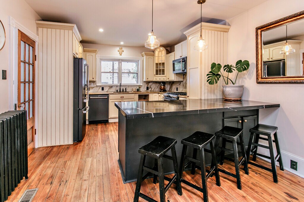 This updated Victorian home at 350 Washington Ave is set back off a quiet one way street and just a five minute walk to downtown Phoenixville. Enjoy sunsets and coffee on the charming front porch overlooking the town. Enter into the original sitting room now featuring an open floor plan and hardwood floors throughout. Tasteful updates include a granite kitchen with soft close cabinets, eat-in island, natural gas range, and GE cafe appliances. Off the kitchen leading to the rear yard is a tiled mudroom with side by side laundry, utility sink, and powder room. The private, two-tiered backyard oasis features a covered patio with natural gas grill and a restful gathering area under a pergola with blooming wisteria vines- all inside your fenced backyard. The decorative staircase leads to the second floor that features the first bedroom, which acts as a great nursery or office, a linen closet, and a full bathroom. Down the hall, the master bedroom, walk in closet, and tiled en-suite bathroom with glass surround shower complete the second floor. On the third floor you will find an additional cedar closet, two well sized bedrooms and stunning views of downtown Phoenixville. Special features of this home include the gorgeous high ceilings and crown molding, large closets with tons of storage, 2 zone central air conditioning, warm natural gas radiators, first floor laundry, and rear street parking behind your cedar privacy fence in Brower alley. Additional storage available in the fieldstone basement that also has a concrete basin sink. Owners open to a multi-year lease agreement to make this your home for the long term!