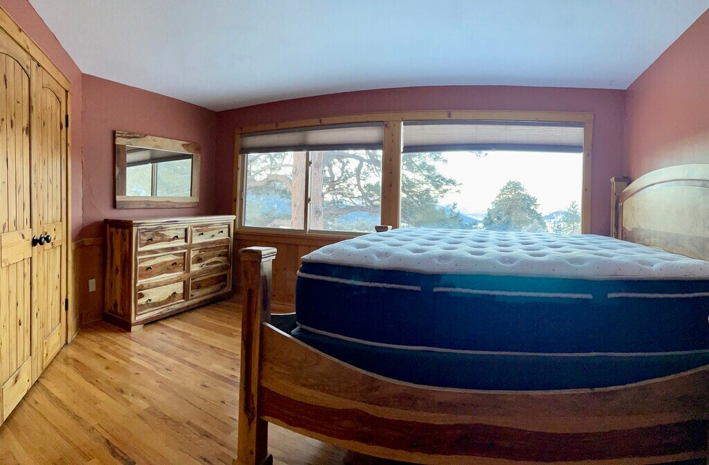 This is a 4-Bedroom home with 3 bathrooms and a washer/dryer on site. Stunning views of the Continental Divide and Estes Valley can be seen from the front of the property. Only 10 minutes to the Safeway for groceries and other necessities. This 11 acre property is a quiet oasis that backs up to a National Forest. It was previously set up as a Bed & Breakfast so has plenty of room to spread out. Your private bedroom has a lock and plenty of storage. Their is actually 2 kitchens on the property. One on the main floor, pictured, and one on the Lower Level. $900 per month for 1 person in a bedroom or $1,350 for 2 people sharing a bedroom. Leases are for a 1 month minimum and background checks are required. Bedrooms come with a King or Queen Sized Bed, Bed Side Tables, Dressers or Cabinets or Closets and Lamps. Individuals would need to bring their own bedding, clothes, and food. Other furniture includes living room couches and sofa chairs, dining room table, front porch couch and tables.
