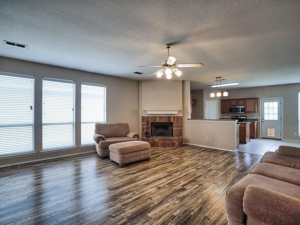 Welcome Home to this charming and meticulously maintained property! Revel in the warmth of wood floors and enjoy the comfort of a two-year-old AC system. The elementary school, conveniently located next door, is within walking distance, making it an ideal choice for families. The delightful drive-up appeal sets the stage for a spacious and inviting interior. Step into a large open family room featuring a wood-burning fireplace and a breakfast bar seamlessly connecting to the kitchen. The versatile fourth bedroom or flex room is easily accessible through the family room. The eat-in kitchen is a focal point – open, bright, and generously equipped with plenty of cabinets. The master bedroom is a retreat in itself, offering ample space, and the master bath is appointed with dual sinks, a garden tub, a separate shower, and a walk-in closet. With split bedrooms, the hall bath is conveniently located just on the other side of the family room. Ceiling fans adorn every room, providing a comfortable and inviting atmosphere. A park and playground are just down the street, enhancing the community appeal. This home seamlessly blends convenience, comfort, and a sense of community – it's more than a house; it's your next home sweet home. Explore the unique charm of this property today!