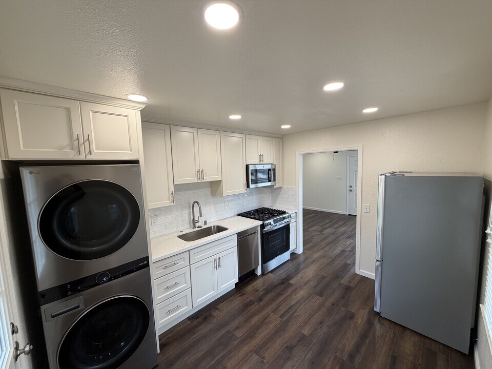 Remodeled, cozy, modern apartment in vibrant Oak Park, Sacramento. This apartment is 2 bedrooms, 1 bathroom and features a fully remodeled kitchen that includes: in-unit washer/dryer, dishwasher, oven, microwave, fridge/freezer, quartz countertops and backsplash. The unit has hardwood flooring throughout and an updated bathroom. Each bedroom has a closet and ceiling fans; the living room has a wall heater for winter and window A/C unit. The apartment has access to one parking spot and a large backyard. Conveniently located near UC Davis Medical Center, parks, and easy freeway access, this home offers the perfect blend of comfort and accessibility!