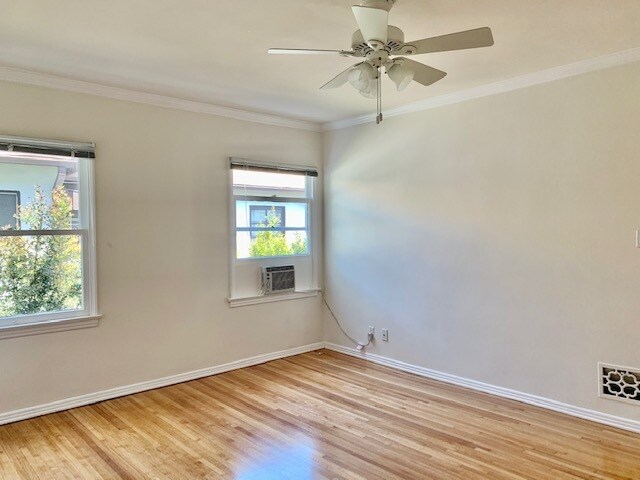 Very large, charming 1 bedroom/1 bath upper unit in the highly coveted Beverlygrove neighborhood. This gem is flooded with natural light, large windows, crown molding and boasts hardwood flooring throughout. Beautiful original tiled bathroom with separate tub and shower. Kitchen has adjacent formal dining room. Large bedroom with walk-in closet. Laundry room inside for washer/dryer hookup and lots of storage. Wall AC units in bedroom and living room. Located just blocks from some of the best restaurants, bars and shopping on 3rd Street, The Grove and Beverly Center. One shared garage included. No pets allowed.
