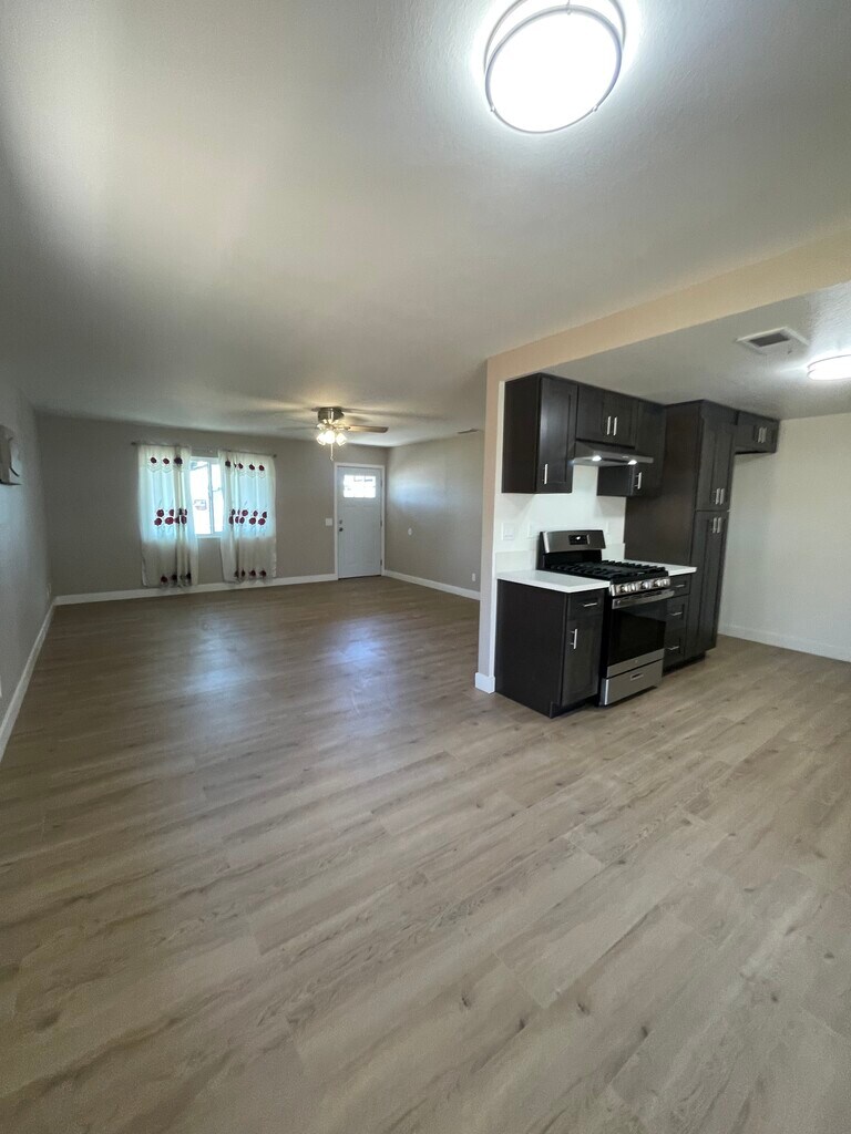 Great Single Family freshly painted inside with new laminate flooring thruout. 3 spacious bedrooms with 1 full bath. Spacious living room open to kitchen and dining area with sliding patio doors leading out to a spacious private backyard with rear access. Central Heating & Air. 2 car attached garage. Section 8 Ok.