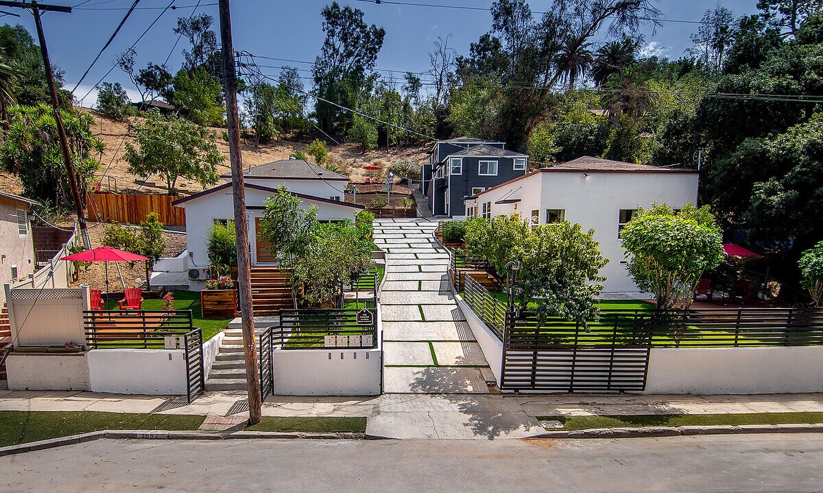 live & work in an amazing place and location. A very beautiful California cottage property has been transformed on a quiet tree lined residential street. Enter thru an architectural gate and pass down a private drive and walk towards the entry to this beautiful home. This is a gated and limited access property. Enter this light filled (big windows) home via your own redwood stairs and landing. This home has a wonderful living room & dining room, Modern designed kitchen (stainless steel, stove, stove hood, dishwasher & fridge) with large stone counters The bathroom has beautiful Carrera tile work, laundry with energy efficient stack washer and dryer, Tankless water heater and heating & air conditioning. There is an LED ceiling fan in the bedroom with nice closet space, LED lighting throughout the house, wide panel walnut doors with oiled bronze hardware. Wide panel engineered hardwood floors through the entire home, double pane energy efficient windows in the home. LED exterior lighting. A large private deck designed for outdoor entertaining and enjoyment. There is 1 car onsite parking behind gates. This apartment feels like a private home. The property sits on over 30,000 square feet of land with nice landscape features and installed custom artwork. This property is in the heart of Lincoln Heights revitalization, very close proximity to Keck USC, The Brewery, and everything the continuous revitalization of Downtown has to offer – entertaining, dining, theater, Disney Hall, Staples, LA Live, clubs, bars, local food