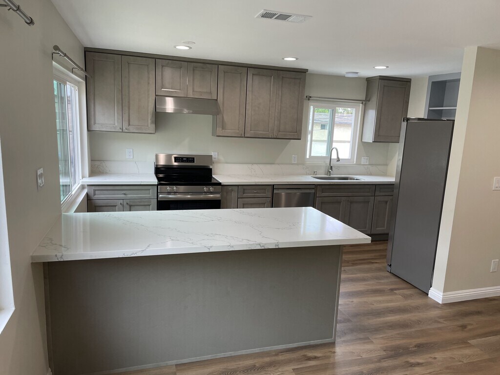 FULLY RENOVATED! All new flooring, kitchen cabinets, bathrooms, showers, Central AC, doors. Beautiful quartz countertops throughout. BRAND NEW refrigerator, dishwasher and electric range/oven. Upstairs unit 3 in a 4 unit complex in Los Alamitos. Comes with detached 1 car garage. Washer and dryer available in the complex. 1 year lease minimum. Message for viewings will try accommodate. Will have another open house 7/29 5pm-6pm with RSVP if not rented by then.