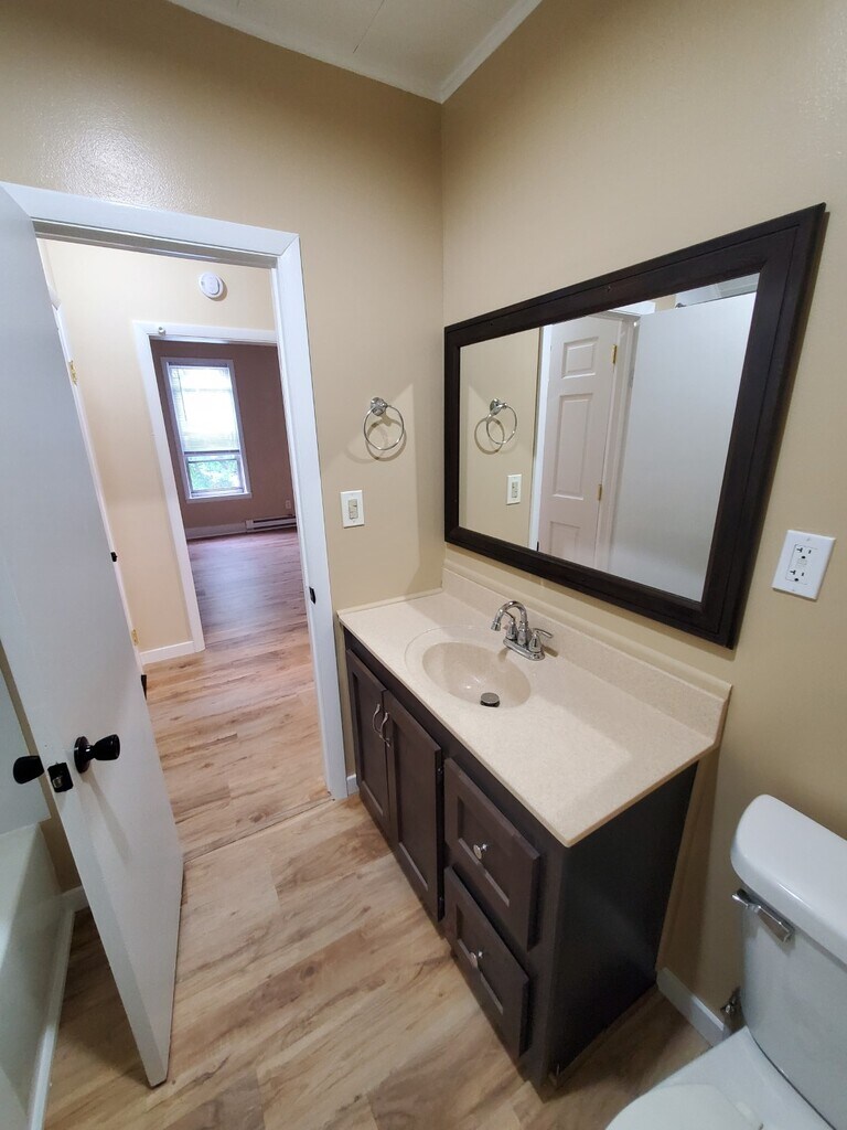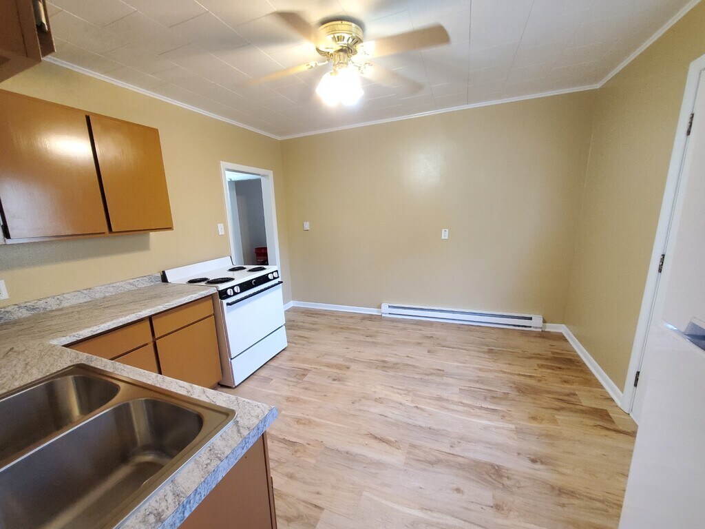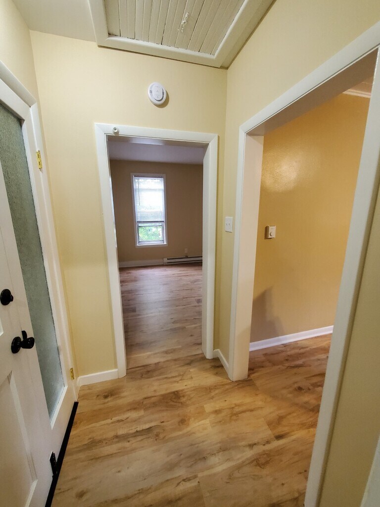 This upper duplex unit features a spacious 1 BD, 1BA. New LVP flooring throughout, completely new bathroom. Large living room, kitchen & bedroom with plenty of closet space, refrigerator and stove as well as counter space. A/C window unit in bedroom, electric baseboard heat w/ individual t-stats in each room, ceiling fan in kitchen. Walking distance to hospital and downtown. Big backyard and off-street parking. Water credit included, tenant pays electric, internet/wifi, cable. The exterior is well-maintained, tenant to keep maintenance of the yard including grass mowing & shoveling, must keep apartment clean. The property is smoke-free, promoting a healthier living environment (no smoking anywhere in the building). No pets. Applicants must have same employer for over a year, be on time with rent as well as be respectful to management and other tenants in the building, no violent behavior. Leases are considered based upon established rental history.