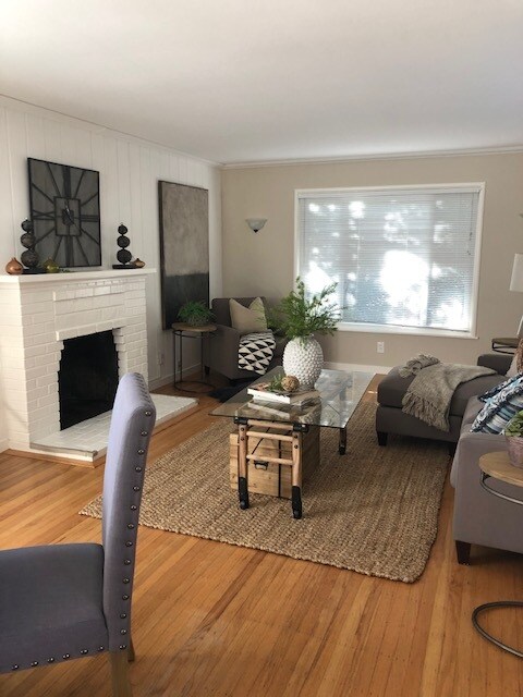 This sunny unit is one half of a Duplex, all on one level. Unique property in unique neighborhood. Walk to Lafayette Reservoir and vibrant downtown. Relax in a verdant landscape on generous patio surrounded by trees. Enjoy sunlight in every room. Hardwood floors throughout, except bathroom. New stone kitchen counter tops enhance generous kitchen. New walk in shower, double vanity and floors just sparkle. Both bedrooms have large closets, Larger bedroom can accommodate king mattress, and perhaps home office. Electrolux washer/dryer in Unit. Central Heat and AC. Shared garage with large private storage area within the garage. Fireplace has electric insert.