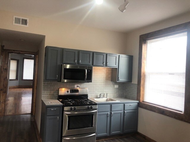 In historic Logan Square beautiful 2 bedroom apartment. Located on the 1st floor of 3 story building, completely remodeled, new kitchen, gray cabinets, stainless steel stove and microwave. Granite tile counter top. New kitchen laminated flooring. Hardwood oak floor thorough living and dining room. Entire apartment recently renovated. Rear deck. Easy access to public transit in booming Logan Square. Couple blocks to trail 606. Close to Blue Line.