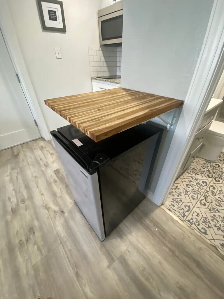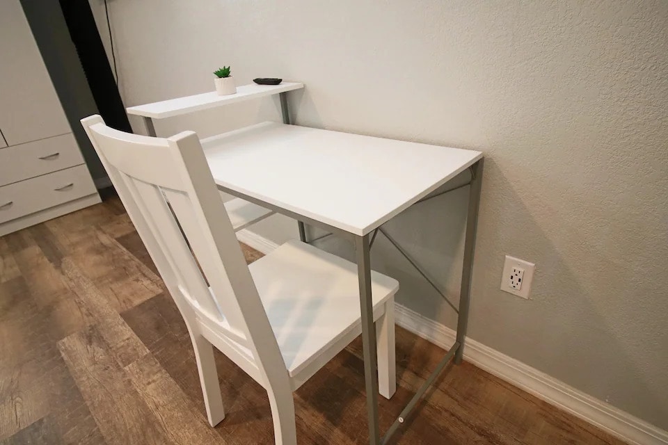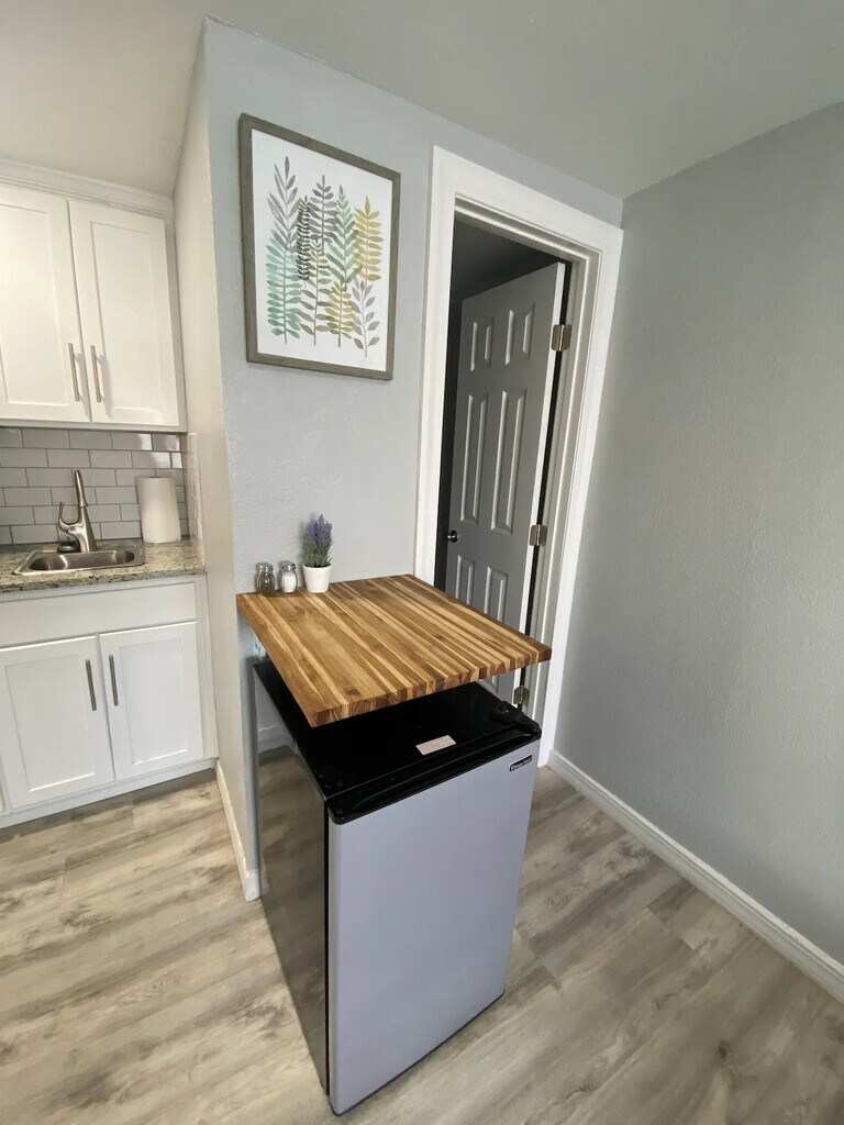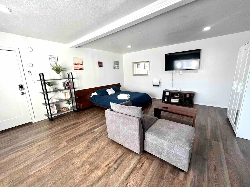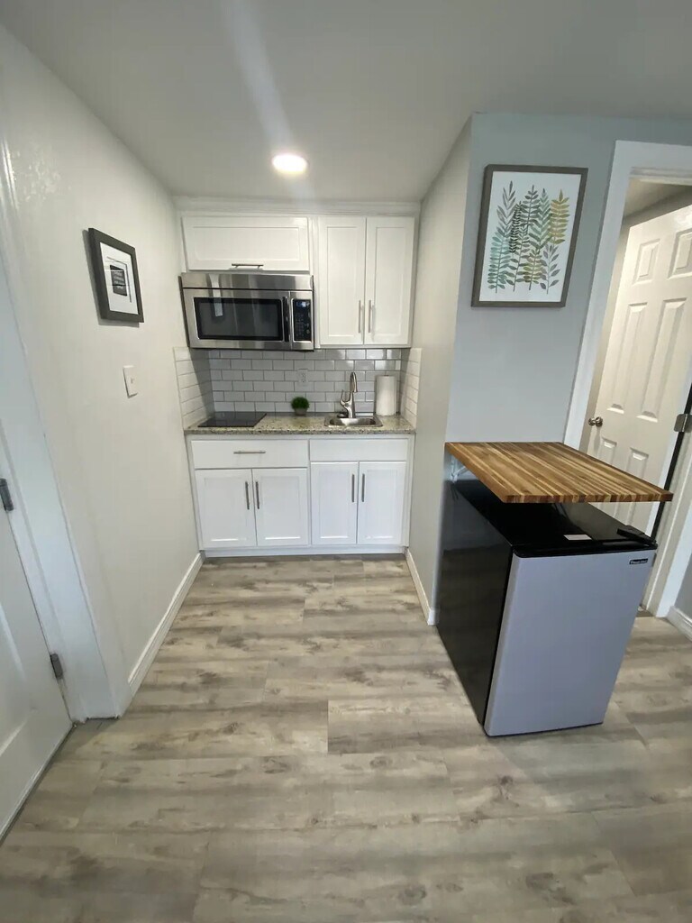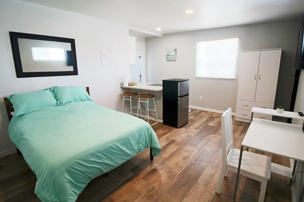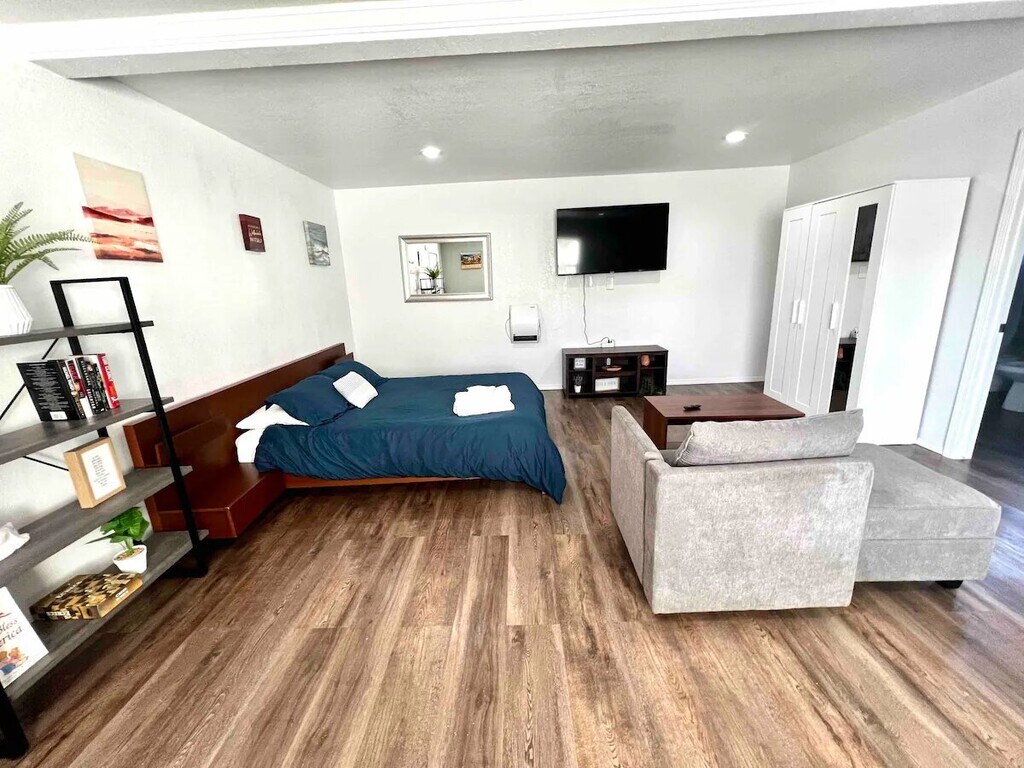 Updated studio with Full size Bed For 1 Person, Equipped Kitchen with Induction Stove, Microwave & Small Fridge, Spacious Shower Room, 43” 4K TV & Fiber Fast internet. Shared Laundry Room & Patio with a Charcoal BBQ to enjoy your evenings.