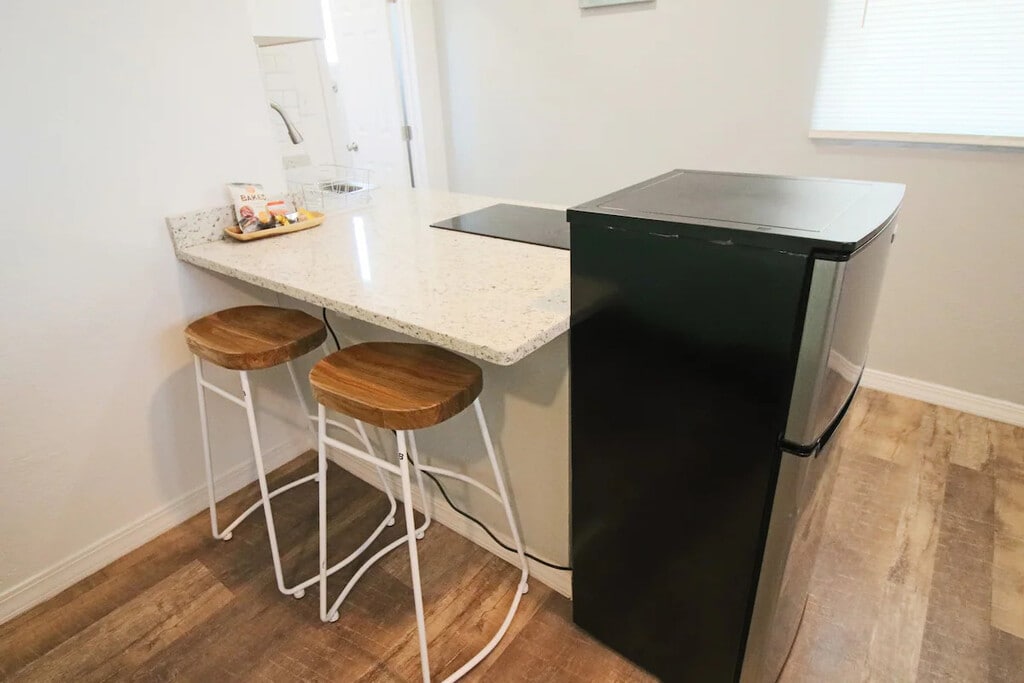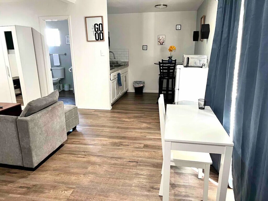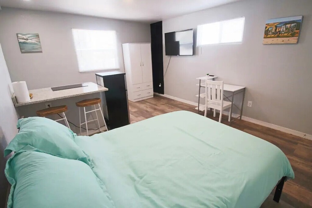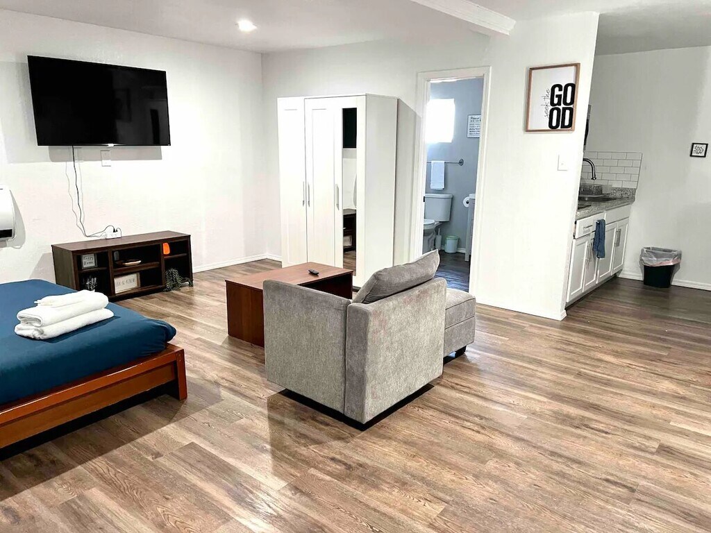Just Listed! Modern Open Concept Studio with Modern Kitchen, Large Bathroom, Cold A/C, 50" 4K TV and Fiber-fast Internet! Kitchen has granite quartz counter top, a bar-like island with two stools, a small fridge to keep your beverages cold, a microwave, coffee maker and pots and pans to cook a quick meal. Comfy Full-size Bed with a Wardrobe, A small desk and chair to work remotely. And a shared washer, dryer as well as a large BBQ to cook perfect steaks! Long stays Welcome! Contact us!
