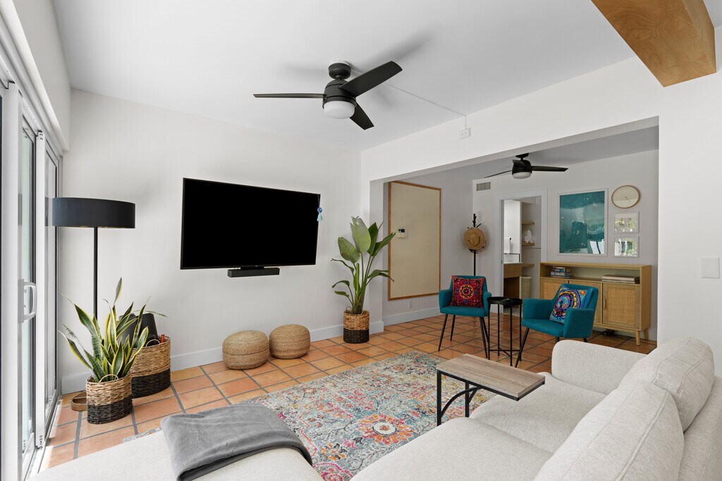 Furnished Annual Rental Available April 2026 This beautifully renovated two-story townhome is offered fully furnished and available for annual lease. Located in a peaceful setting just three blocks from the beach and one block from Atlantic Ave, offering walkable access to everything the area has to offer. Designed for comfort and functionality, the open-concept first floor features a spacious layout ideal for both everyday living and entertaining. The kitchen showcases a 10-foot island perfect for cooking and gathering, while the adjacent dining area comfortably seats six. The living room offers ample seating and is framed by floor-to-ceiling sliding glass doors that fill the space with natural light. A full bathroom on the main level adds convenience and flexibility. Upstairs, the home offers two bedrooms one with a king bed and one with a queen each with generous closet space. A full bathroom is located off the hallway, easily accessible to both bedrooms. Outdoor living is a highlight of this property, with a private 20' x 20' paved backyard patio ideal for outdoor dining or relaxing evenings. An additional upstairs balcony, accessible from one of the bedrooms, provides a quiet space to enjoy Florida's sunshine. The home includes one dedicated parking space located just steps from the front door and is offered fully furnished for a seamless move-in experience. Tenant pays all utilities (electric, gas, water, trash, internet). No smoking allowed.