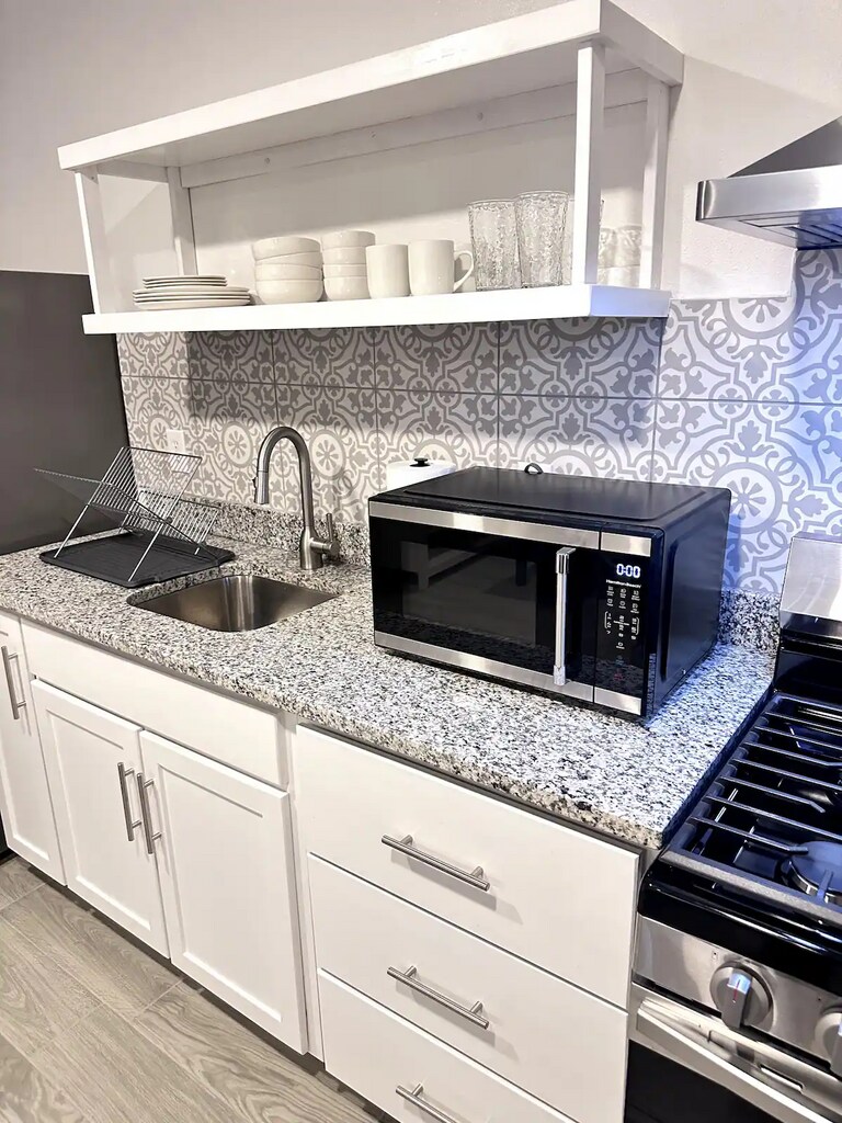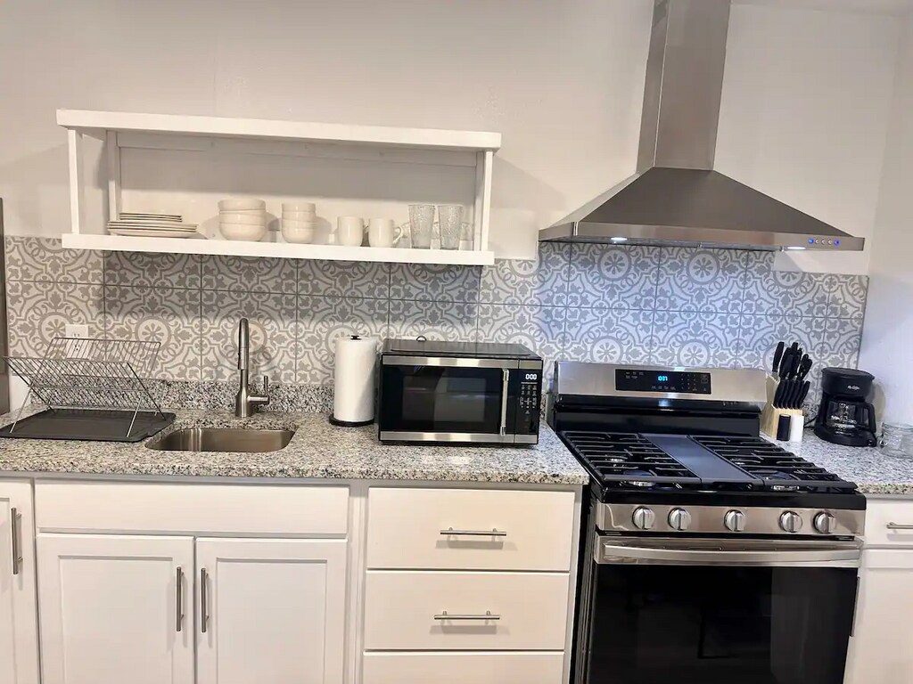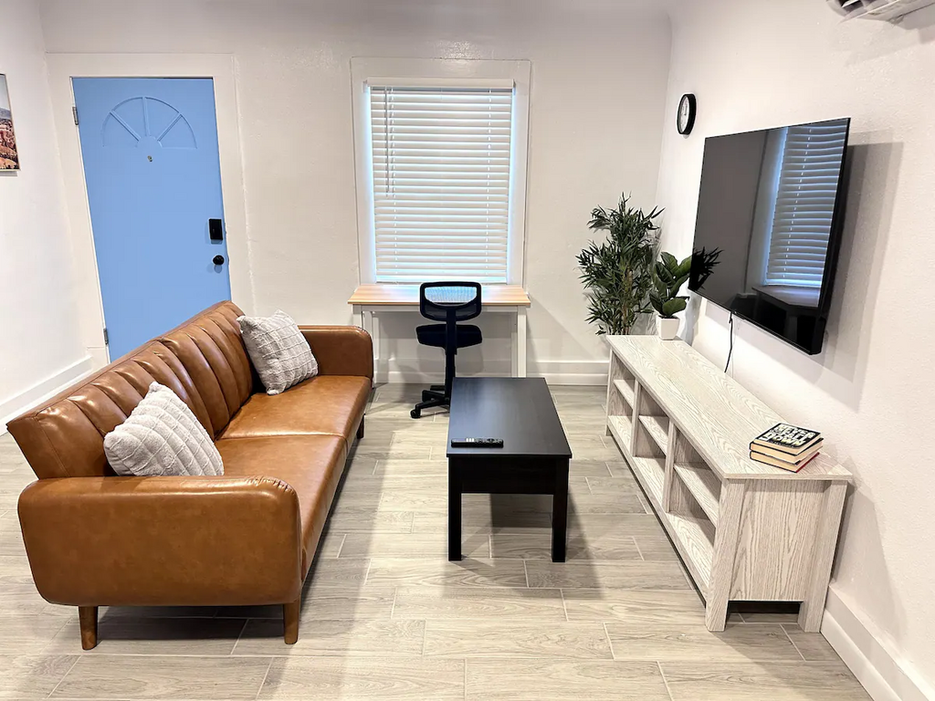 Just Listed! - a charming small house featuring a spacious living area with a comfy 3-seat sofa and 58" 4K TV for your entertainment, alongside a work desk. The fully equipped kitchen boasts a stainless steel Samsung gas stove, microwave, and fridge, complete with all necessary cookware. Relax in the cozy bedroom with a queen-size bed and 12" Zinus memory foam mattress, spacious closet, and dresser. The modern bathroom offers a bathtub and sleek vanity.