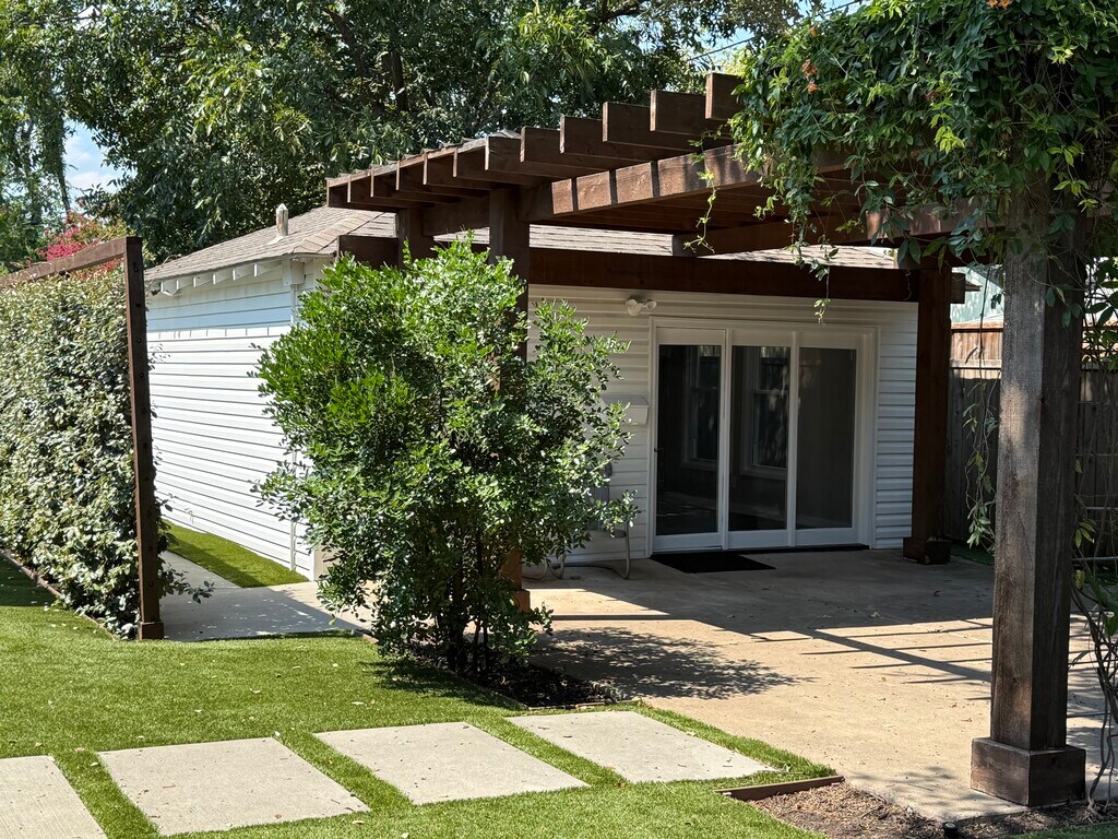 This detached garage studio/efficiency apartment is inviting, private, and well maintained. Because the structure is freestanding, it has the feel of a small home, rather than an apartment. It's well located in the near-north Dallas neighborhood of Midway Hollow, close to the intersection of Midway and Northwest Highway. The fenced backyard setting is attractive, with a mature live oak tree and pergola-covered patio for tenant use. The living, bedroom and kitchen areas are all open to each other. The tall, vaulted ceiling and skylight give a sense of openness to the cozy space. Amenities include luxury vinyl plank flooring, ceiling fan, quartz kitchen countertops and custom roller shades (new) on the windows. The kitchen includes a refrigerator (with ice maker), dishwasher (new), range, microwave (new) and disposer. Storage is maximized throughout with a closet organizer, tall kitchen cabinets and shelving in the bathroom. Off-street parking is available on the owner's front yard driveway. Tenant will have access to washer and dryer in the owner's garage. Tenant pets are not allowed. However, the prospective tenant is advised that the owner has two dogs that will have access to the backyard where the apartment is located. Tenant should be comfortable with the presence of those dogs in close proximity to the apartment. No smoking is allowed inside the apartment. A background check will be required. The $1,150 monthly rent includes water only. Electricity is sub-metered and will be billed monthly by the owner. Internet is arranged and paid by the tenant. Security deposit is $700. $150 application fee will apply toward security deposit. Minimum one-year lease is required.