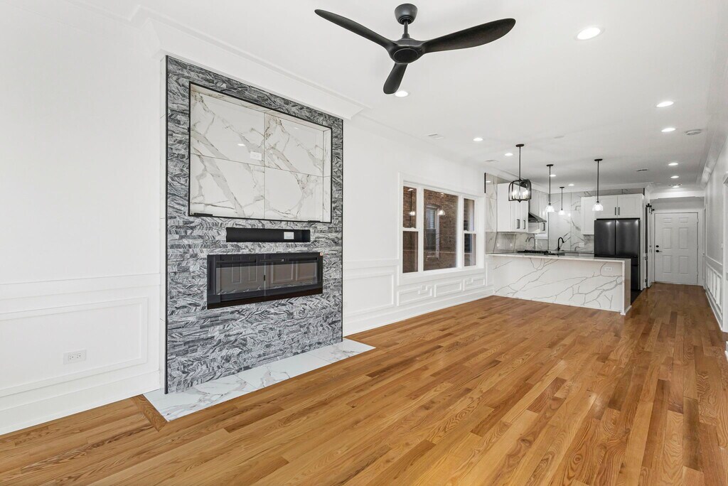 Stunning 2 bed/1 bath in the highly sought-after Irving Park neighborhood. Upon entry, you'll be greeted by rich hardwood floors that flow seamlessly throughout the home, complemented by soaring 9-foot ceilings that create an airy, open feel. The living room features a stylish fireplace with built-in, cable-ready TV connection, perfect for cozy evenings or entertaining. A dedicated dining room offers an ideal space for hosting. The chef's kitchen is thoughtfully designed with abundant cabinetry and top-of-the-line appliances, including a premium refrigerator, dishwasher, hood range, microwave and stove blending function with elevated style. Both bedrooms are generously sized and enhanced with custom closet organizers. The impeccably finished bathroom boasts a sleek walk-in shower with refined finishes. For added convenience, the unit includes an in-unit washer and dryer. Unbeatable location: Enjoy close proximity to Horner Park, neighborhood restaurants, shopping, expressways, CTA, and Metra offering the perfect balance of lifestyle and accessibility. Garage parking available for $225/month. Garage does have an EV Charger. A truly exceptional opportunity to live in one of Chicago's most desirable neighborhood.