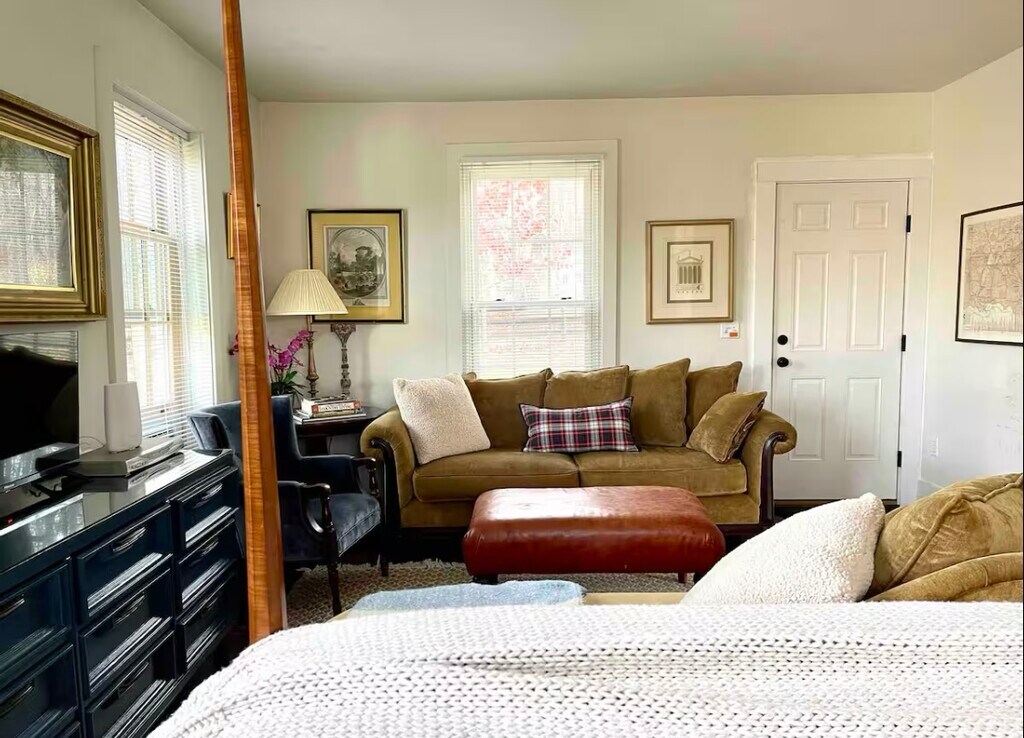 Welcome to Brookdale Farm! This historic home is located on a rural, tree lined, gravel road south of Lovettsville, VA. The Guesthouse is adjacent to main house sharing a yard and stone patio. The Guesthouse was an old schoolhouse renovated as a 2 room home. The main room is a living room and bedroom combination. The second space holds the kitchen and dining area. Beyond the kitchen is a full bathroom with tub/ shower. Laundry facilities are shared at the main house. The property boasts bucolic views, a pond and farm animals.