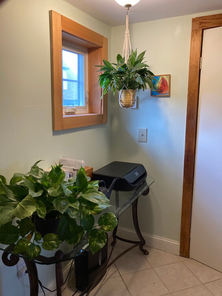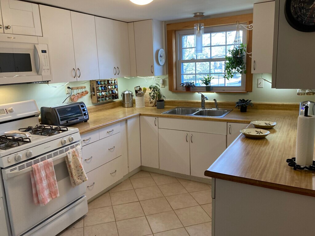 The Bird Nest is a loft apartment at the back of the house with no direct neighbors accessed by a private entrance. It has a sunken livingroom and two bedrooms all newer hardwood flooring. The Kitchen, dining area and bath have radiant heat tiles. The living room has a high ceiling, walk in coat closet and storage closet with shelves. The kitchen has a fridge with ice maker and filtered water dispenser on the door, gas stove, built in microwave and ample cupboard space. There is no dishwasher. There is a large storage closet. The bathroom has a designer sink and faucet, newer tub and shower, shelving for towels, two medicine cabinets and adjustable close up mirror. The first bedroom is large with room for a seating area or desk and good sized closet. The second bedroom is smaller with a clothes hanging area. The deck is private as is the yard below (with room for a clothes line). The laundry room is one flight down with dedicated hookups for washer and dryer. Off-street parking for two cars is included. Snow shoveling and driveway plowing are contracted out - no shoveling for the tenants.