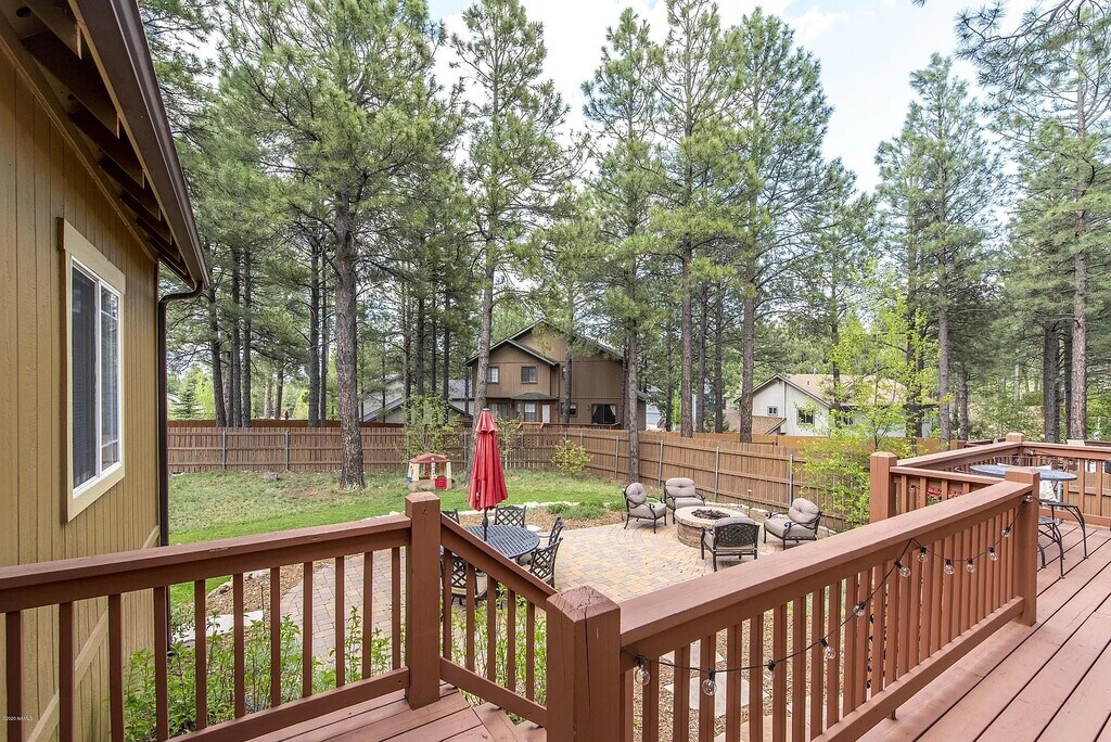 SHORT-TERM (90 Day Minimum) Fully Furnished Rental. Welcome to the Ponderosa Trail Retreat - your home away from home! Nestled in the Ponderosa pines of Flagstaff's Ponderosa Trail Neighborhood, this home offers a premium location on a 10,000 square foot lot with views of the San Francisco Peaks and immediate access to the neighborhood's Flagstaff Urban Trail System (FUTS). Inside the home, you'll find the dining room, then the chef's kitchen with double oven and gas stovetop, opening to the living room with two story windows, and the two level patio. The master bedroom is on the first floor with an incredibly spacious bathroom and there are two bedrooms upstairs, both with bunk beds, and one with a bunk bad that expands to a king on the bottom, and trundle underneath. Parking in driveway (and street parking outside of winter months).