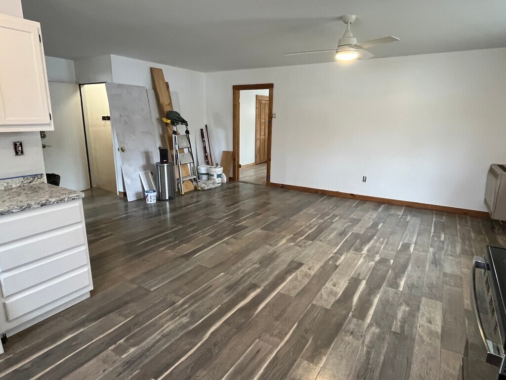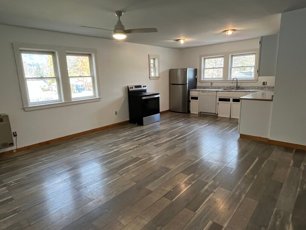 Light bright large 1 bedroom 1 bath apartment over the garage. All new paint and almost new appliances make this a nicely upgraded space. There is a small deck off the back of the unit with a nice view of the large shared backyard. Unit includes one parking space in the garage along with a workspace area. There is a main house, so the garage and backyard will be considered a common area. The main house will be complete in a month or so, so could possibly be a nice situation for a family and in-law unit. Quiet street in Norway, close to town, restaurants and grocery stores. Washer/Dryer in the unit. Pet considered with pet deposit.