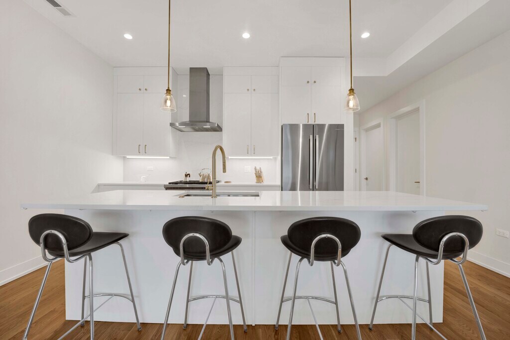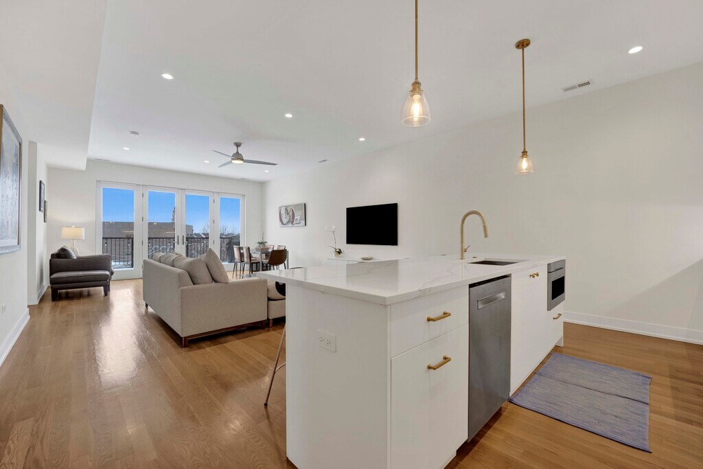 Stunning 3-bedroom, 2-bath luxury condo in the heart of North Center, featuring a bright and spacious open-concept layout with wide-plank hardwood floors throughout. The sleek, modern kitchen offers quartz countertops, custom white cabinetry, updated stainless steel appliances, a large island with seating, and designer pendant lighting, perfect for everyday living and entertaining. The expansive living and dining area is filled with natural light and opens to a private outdoor space through floor-to-ceiling glass doors. The primary suite includes ample closet space and a spa-like bath with contemporary finishes. Additional highlights include in-unit laundry, two private outdoor spaces, central air, and one garage parking space included. Ideally located near North Center dining, shopping, parks, and public transportation.