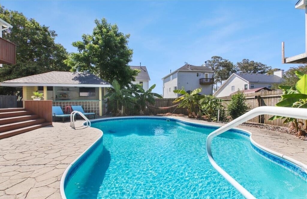 Rudee Heights - between Croatan & Rudee Inlet! outstanding location - 3 bedroom, 2.5 bath beach home, open & light - loads of natural light with vaulted ceiling in entry & both primary & one of two guest bedrooms. Primary suite with large bath, double vanity & huge walk-in closet. Bamboo flooring throughout first floor, open kitchen with granite counters & glass tile backsplash. Stainless appliances, beautiful light fixtures, peaceful beach decor. Cozy gas fireplace in living room. Deck off dining to backyard oasis - inground salt pool, tiki bar, outdoor shower & more. Tropical plants, large patio area, plenty of entertaining area. This is truly beach life at its very best! A great opportunity to live near the ocean & enjoy all this community has to offer!