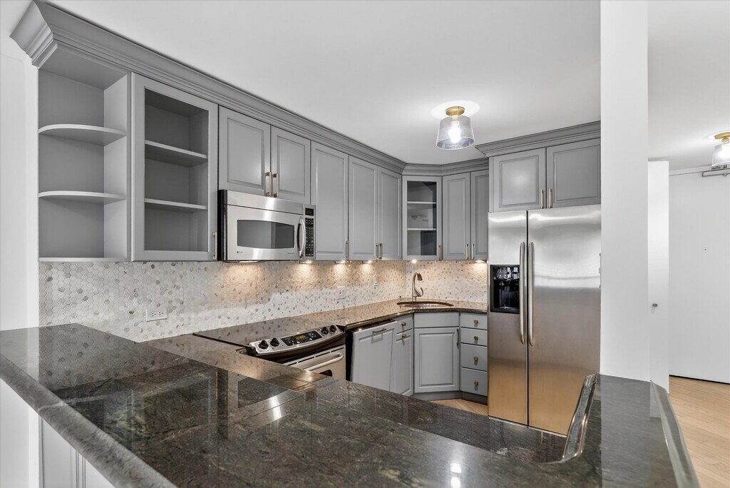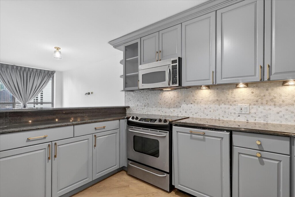 AVAILABLE NOW: No Pet, Non-smoking building. Discover this bright, north-facing one-bedroom home in the heart of River North, perfectly positioned near some of Chicago's best dining, shopping, and entertainment. Sunlight fills the space, highlighting recently refinished hardwood floors that run throughout the unit. A rare in-unit washer and dryer add everyday convenience. The fully updated kitchen features modern cabinetry, stainless steel appliances, an elegant marble backsplash, expanded counter space, and a breakfast bar ideal for casual dining or entertaining. The bathroom has been thoughtfully upgraded with a new vanity, Porcelanosa tile finishes, updated lighting, and a full-size mirror for a clean, contemporary feel. The bedroom includes recessed lighting and generous closet space, providing both comfort and functionality. Located in a sought-after building, this home offers an exceptional opportunity to enjoy city living just steps from the Riverwalk, the Magnificent Mile, Millennium Park, public transportation, grocery stores, and more. Call Stephen to schedule a tour today! Ref # 12 562737 Stephen John Suominen Broker Compass Listing Courtesy of @properties