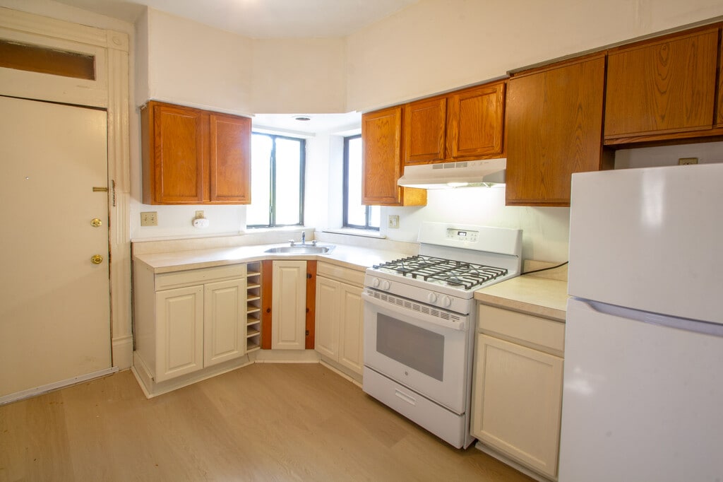 Located on the second floor of the building. Features: stunning polished hardwood floors, private covered balcony, full kitchen with dishwasher, lots of cabinets, built-in china cabinet and cupboards. Two large bedrooms. Secure entrance. Cats and dogs are welcome. Heat is included with the price of rent. Street parking is easy and free. Great neighborhood. In addition to monthly rent tenant pays for electric and cooking gas. All of our apartments are non-smoking.