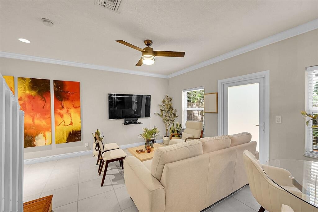 Spacious 3BR/2.5BA Townhome with 2-Car Garage in Pompano Beach. Well-maintained townhome featuring open layout, ceramic tile floors, and modern kitchen with granite countertops and stainless steel appliances. Half bath on main floor for guests. Private fenced courtyard with brand-new wood deck, palm trees, and white rock--perfect for relaxing or entertaining. Upstairs offers 3 bedrooms with wood flooring (no carpet). Primary suite includes walk-in closet and updated bath with dual sinks and walk-in shower. Upstairs laundry for added convenience. Impact-rated, noise-reducing windows and doors throughout. Attached 2-car garage.