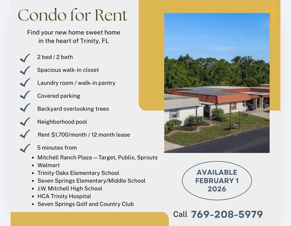 Tours available upon request. Discover your new home in this beautifully updated 2-bedroom, 2-bathroom condominium, perfectly situated in the heart of Trinity, FL. This move-in-ready unit combines modern upgrades with a serene setting. This home features newly renovated bathrooms, a spacious primary suite walk-in closet, a walk-in pantry/ laundry room, and a private enclosed lanai overlooking lush trees and a tranquil canal. This home is located within 5 minutes of Mitchell Ranch Plaza, excellent local public schools and our community hospital. Nestled in a peaceful family-friendly neighborhood yet centrally located for easy access to all Trinity and New Port Richey have to offer. Don't miss out on this opportunity to live in a beautifully updated condo in one of Trinity's most desirable areas.