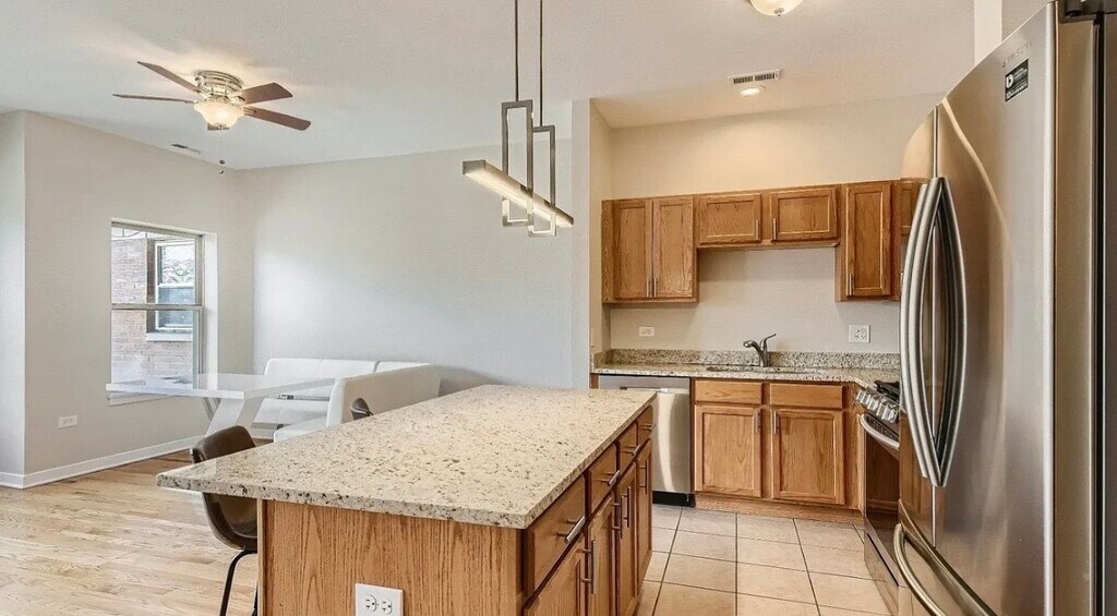 Check out the serene view from this top floor unit overlooking historic Drexel Boulevard. You are going to love the open living/kitchen with Samsung french door stainless fridge and stainless steel appliances, granite countertops and Zephyr Tamburo exterior vented range hood. Good-sized bedrooms - both with walk-in-closets and new durable luxury vinyl plank flooring. Large bathroom with soaking tub and double vanity. Brand new front loading in-unit laundry. Open back deck to enjoy the outdoors.. Dedicated parking space right behind the unit. 4 blocks to the lake front bike path, and close to 31st street beach and Lake Shore Drive. No security deposit. Move-in fee: $500 Application fee: $65 NO EVICTIONS, CREDIT SCORE MINIMUM OF 650.