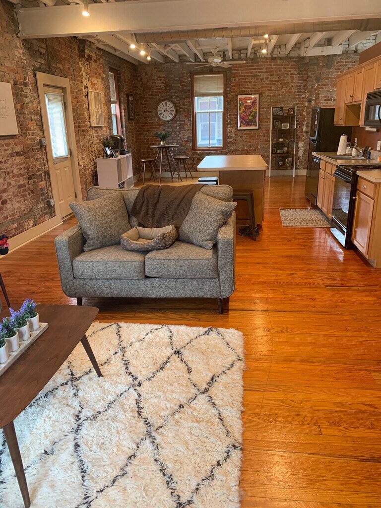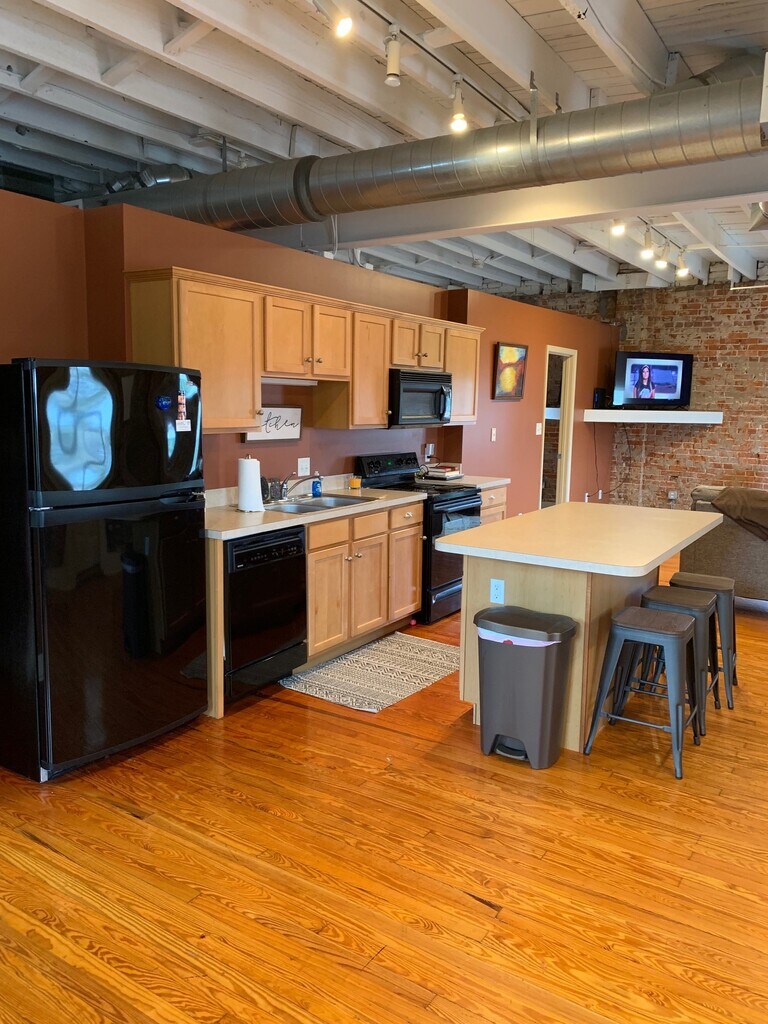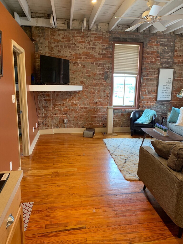 Downtown Loft Apartment. Open floor plan, hardwood floors, brick walls, ample storage space, and outdoor deck.