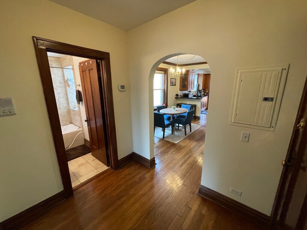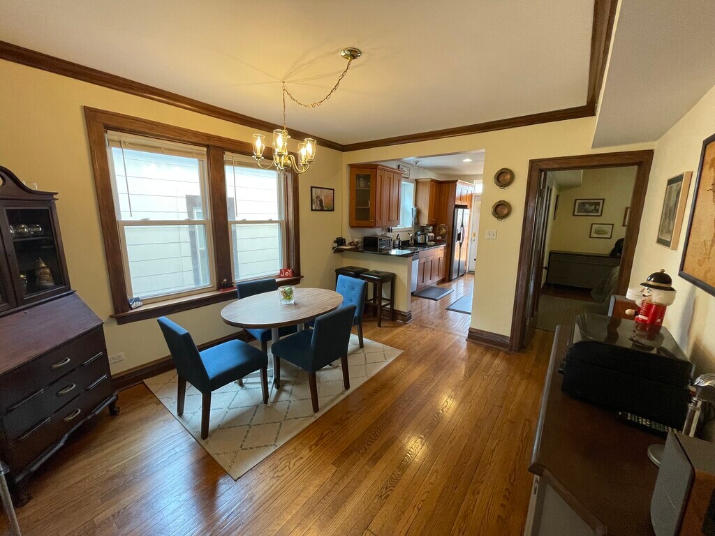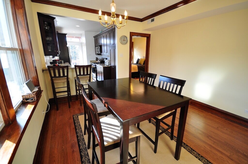 The layout of this apartment is excellent and it has sunlight all day with S, E and W exposure. The evenings are full of golden sunsets that pour in from the back porch into the kitchen and dining room. The apartment has two large bedrooms with ample closets. The hardwood floors, crown molding and exposed wood give it that classic Chicago style feel. There are all new amenities in the kitchen and bathroom. The bathroom has a jacuzzi tub, On Demand hot water and a beautiful vanity. The dining room and kitchen are joined by a breakfast bar. The kitchen is fit for a gourmet, it has D/W and in unit Laundry as well. The exterior back porch over looks a large backyard with garage roof deck for shared use. The neighborhood is quiet and is located 1 block West of Horner Park. The neighborhood is very desirable and convenient. Mariano's, Costco, Jewel, Aldi's and Trader Joe's are all close by. Restaurants, bars, theater's and nightlife are all close by. The Irving Park bus is one block away as is the California Bus, Montrose bus three blocks, Brown line five blocks and three blocks to the Wrigley Field Shuttle Bus. Many parks and the river are close by. It is conveniently located in between LSD and 90/94. No cigarette smoking and no pets. Visit our website at mozartbythepark.(com) for more info.