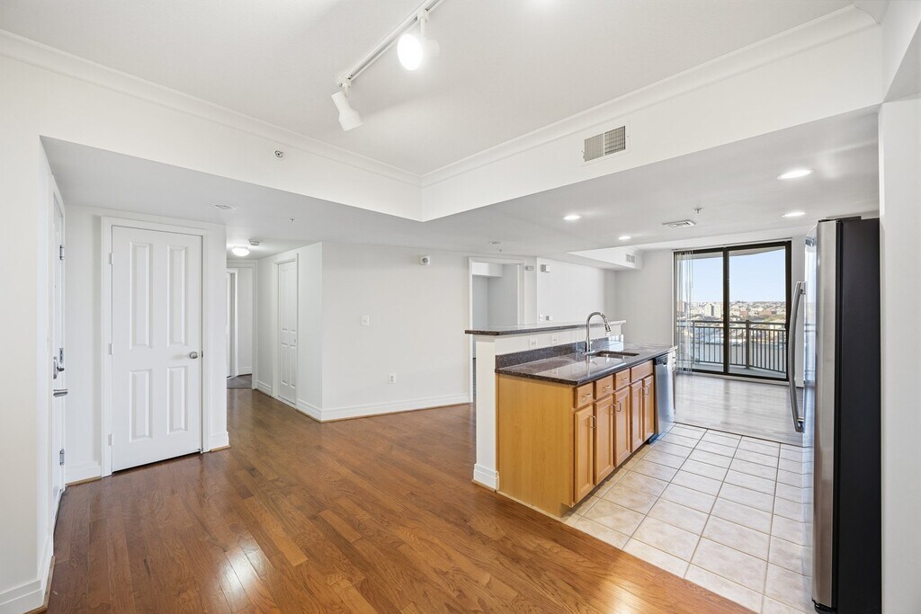 Available immediately for a minimum one year lease. Beautifully updated condo in an amenity rich building in a great location with parking! 2 Bedroom, 2 full bathroom home with laminate wood floors throughout, and balcony with great city views! Stainless steel appliances and granite counters in the kitchen opens to the dining and living area. Wahser and dryer in unit. Building amenities include an outdoor pool, exercise room, secure access and parking garage. Water is included in rent, but all utilities are the responsibility of the tenant. One assigned parking space in secure garage is included, but tenants can also choose to purchase additional parking spots if they would like, directly from the building. The unit also includes an (approximately) 6' x 6' x 9' storage unit, located on the Mezzanine (M) floor. Pets possible. Dogs have to be registered with the building with a $30 flat fee annually, plus a $35/pet monthly rent. The $250 building move-in fee is refundable.