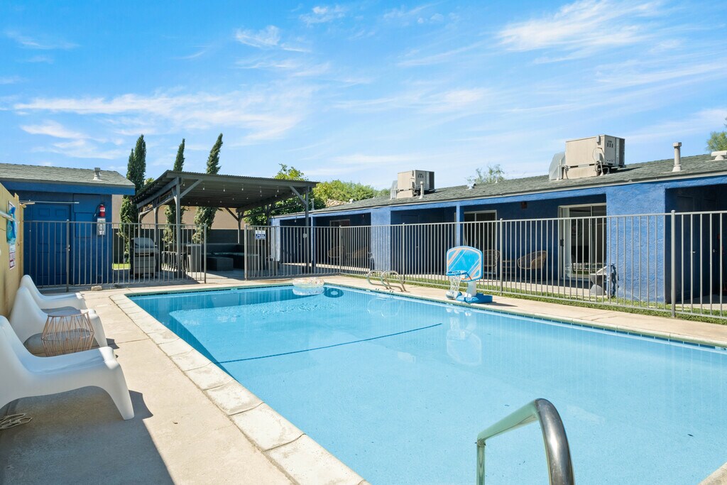 This apartment is part of an amazing triplex, located near Bermuda Dunes airport and Country Club with easy access to everything great that the Greater Palm Desert area has to offer. It's also close to schools, restaurants and retail amenities. The apartment is a 2 bedroom, 1 bathroom single level unit. The living room has a cathedral ceiling opening to a modern kitchen. There is a private patio space with easy access to the sparkling pool, barbecue area, and fire pit lounge area. The unit has polished floors concrete floors, central air conditioning, upgraded kitchen with quartz countertops and stainless steel appliances. There is a common laundry room outside. Two open parking spaces in the back of the property and ample street parking. Owner pays for water, trash, gardening and pool maintenance. Renter pays electricity and gas bills.