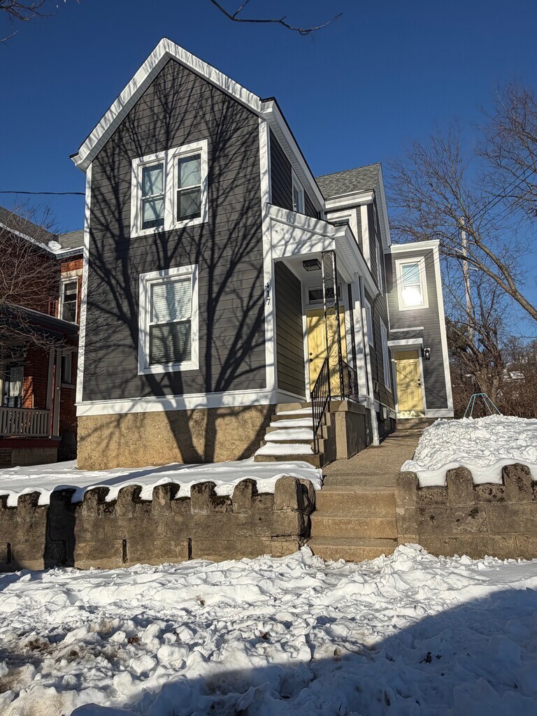 Wonderful 2 unit property located next store to city park. Both units completely remodeled. This is the upstairs unit. It includes a separate entrance in back of property with a private balcony. There is off street parking. The property has steam heat that is paid by property owner. You will have half of basement for storage as well as access to laundry machine that are also paid for by owner. The apartment has new ceiling fans in every room. New laminate flooring throughout. We do not accept pets. A smoke-free unit. Single thermostat is in downstairs unit due to steam heat. You do not want to miss out!