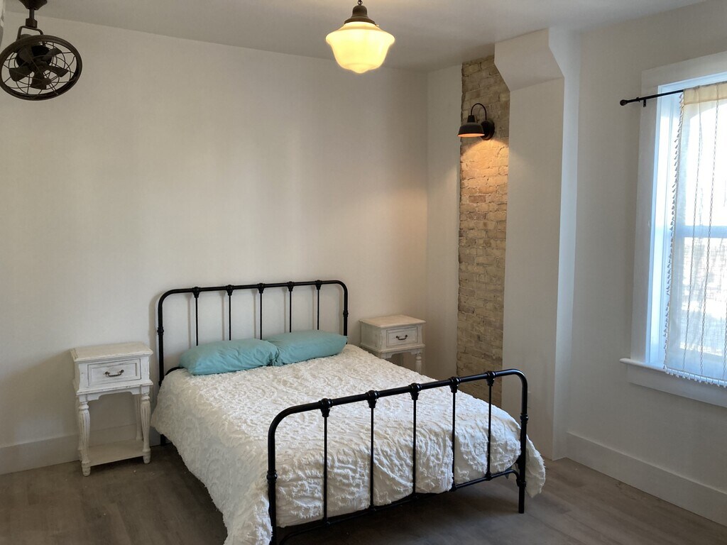 hey there. the rear 2-bedroom unit, on the second floor of my 130 yr-old main street building is available to rent as of november 1st! there are only 2 residential units in the building (with commercial space below). this is the south-facing one, so it gets a ton of cheery sunlight! (& is nice & quiet, since it's set back from main street.) there's a shared deck overlooking a quaint little city park w/ a pond & gazebo (that hosts live music on thursdays throughout summer) i hesitate to call them "luxury apartments"... but, hey; they are pretty well-appointed units-- only 1-year old, 2nd floor, european-modern (w/ "farmhouse" details:), in a rehabbed historical building, with a great view!? and you only have one neighbor. we tried to retain the integrity of the historic building (the hallway has exposed brick!) by using real wood trim & doors, for example... and then tried to apply a scandinavian sense of design by keeping things light and austere. unit B's kitchen boasts butcher-block countertops, soft-close cabinetry, a double basin "apron" sink, an (ergonomic) wall oven, undercabinet lighting (of course), a Bosch dishwasher & a built-in corner "booth" dining table! the second "bed room" probably feels more like a den/office, and lacks a closet (there are 2 closets in the spacious master). there's a cozy reading nook next to one of the four south-facing windows. we (consciously) chose to embrace the future, by not using gas appliances. (plus our roof is covered with solar panels:) so the hvac system uses "heat pump" technology. (instead of forced air through ducts, there are wall units that silently provide warm or cool air). then there's an induction cooktop & electric oven. but, guess what-- i will INCLUDE UTILITIES in the rent! (including internet). to sweeten the pot, there's a common space between units A & B. this common space contains a rec room (w/ a large TV & pub tables, etc.) AND a guest bedroom/bathroom (that either tenant can reserve when needed). this effectively expands the square-footage of your home , when you consider you have access to this shared space. laundry is in the back hall. there's even a small work-out room (& bumper pool room) in the basement you can use. the apartment is probably best suited to a couple, i'd say... based on the overall size of the rooms. oh yeah, there's no elevator in the building, so you have to be good with stairs. but the location is pretty ideal. a stone's throw from the opera house-- you'll be able to walk to all of the restaurants & shops that vibrant downtown stoughton has to offer! we love it here. sorry-- no pets:/