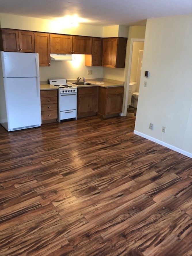 AVAIL JUNE 1, 2026. NO PETS 0 VOUCHERS Rent is $960 total. 2 bedroom apartment suitable for 2-3 people (add $200 for a 3rd person).This apartment is located right across the street from Bloedow’s Bakery. This unit comes with a wall sleeve air conditioner, security lighting and some off-street parking. Fresh paint, new wood flooring throughout, new kitchen and bathroom cabinets as well as new tub and shower surround. Newer refrigerator, range and dishwasher. There are several Laundromats that are close. Water, lawn maintenance, snow and trash removal are included in rent. Tenant pays only for electricity and WiFi. All units have up to date smoke alarms and CO detectors installed for your safety. All of our units are non smoking. We show apartments all days of the week with a respectful 24 hour notice to our current tenants. We do not allow pets in this building. 1 month rent Security Deposit and last month’s rent are due at lease signing.