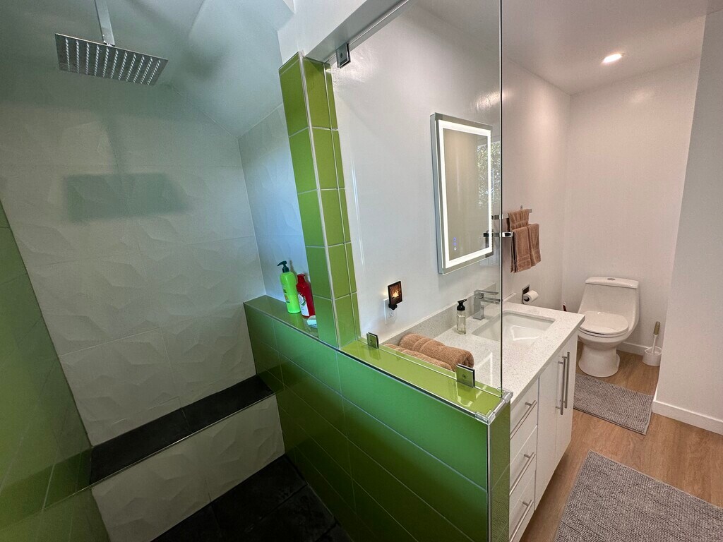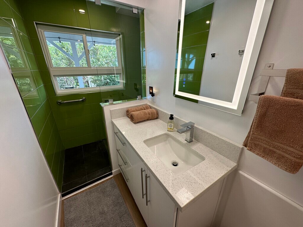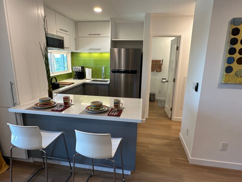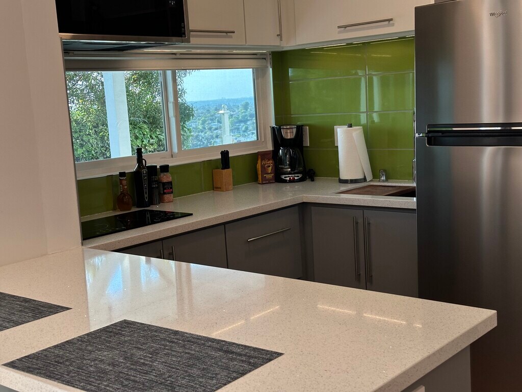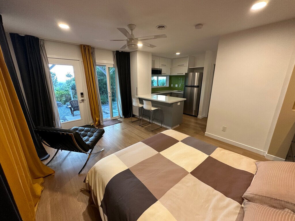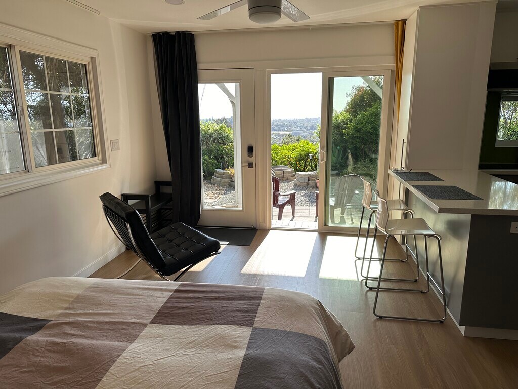 Sleek, independent garden studio on the hills with panoramic views over San Diego!. Come home to this comfy and open concept studio to enjoy daily sunsets and open skies from this beautifully updated garden studio where light abounds and a constant sea breeze keeps your space cool during the summer. This furnished or *unfurnished space features large patio doors and windows that let in plenty of natural light, an ample bed area, closet, large mirrors, a kitchenette and a private bathroom. The kitchenette is fully equipped with an induction cooktop, microwave oven, deep sink, dishwasher and all the basic cooking ware plus plenty of cabinet space. Large quartz counter tops, LED lighting and direct access to the laundry area. Step outside onto a covered terrace and enjoy a beautifully landscaped garden where fresh air, sunshine and open views await. There's plenty of parking on this quiet and safe upper street and it's located close to all the amenities you'll need: La Mesa Village with its variety of restaurants, shops, and even a trolley line station if you don't feel like driving downtown San Diego or to Mission Valley. This studio is the perfect place to call home for anyone looking for a compact, conveniently located, and stylish space with stunning views and a relaxing setting. Contact us today to schedule a viewing! (*unfurnished option only for lease of 1 year lease or longer)