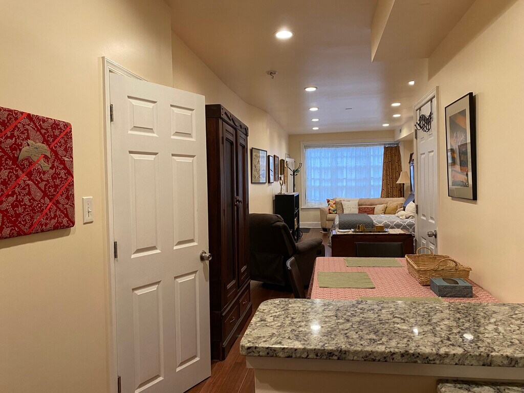 Beautiful furnished, fully renovated studio in a small building on a quiet pedestrian street. Central A/C. Restaurants and takeout places within minutes of walking distance. Free parking across the street. Train to center city 3 blocks away. Secure backyard/patio.